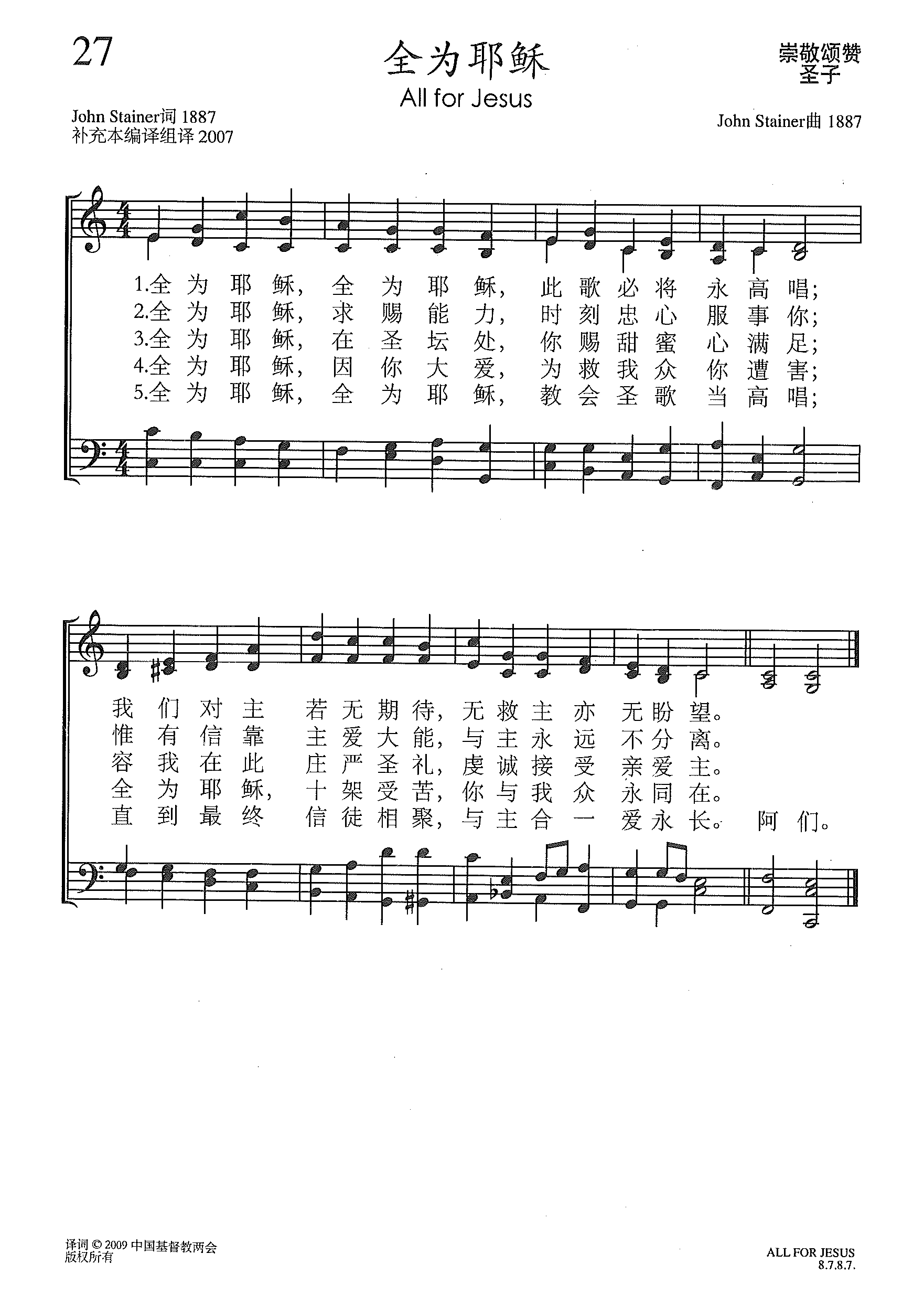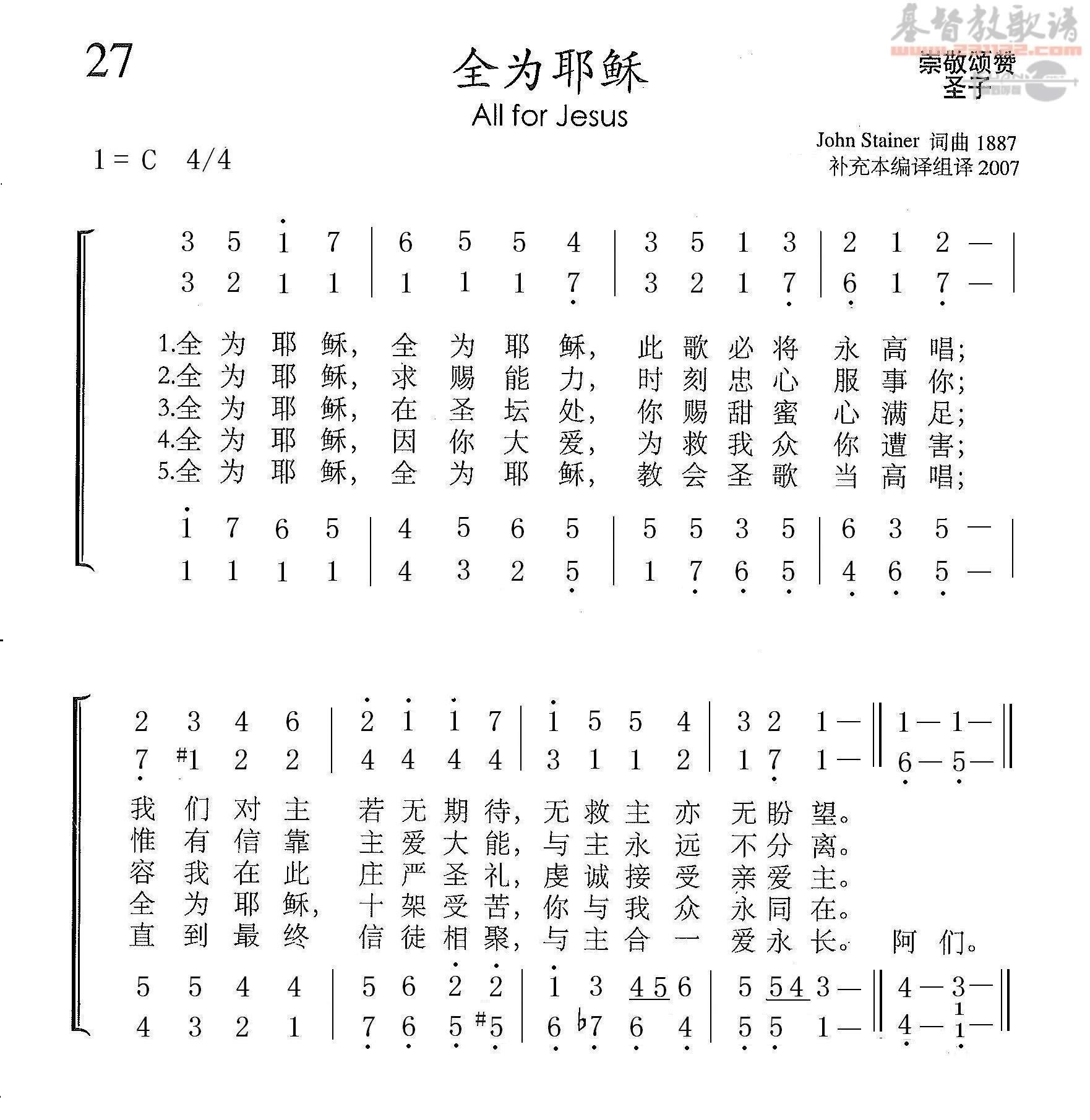 全为耶稣 ( All for Jesus ) 2022年4月12日 作者 Liu, Luke 在线播放和下载: 合唱 四声 https://www.xueshengshi.com/wp-content/uploads/2022/04/20220412_000748.mp3 下载 女高 https://www.xueshengshi.com/wp-content/uploads/2022/04/20220412_000734.mp3 下载 女低 https://www.xueshengshi.com/wp-content/uploads/2022/04/20220412_000723.mp3 下载 男高 https://www.xueshengshi.com/wp-content/uploads/2022/04/20220412_000712.mp3 下载 男低 https://www.xueshengshi.com/wp-content/uploads/2022/04/20220412_000700.mp3 下载 伴奏 四声 https://www.xueshengshi.com/wp-content/uploads/2022/04/20220412_000739.mp3 下载 女高 https://www.xueshengshi.com/wp-content/uploads/2022/04/20220412_000729.mp3 下载 女低 https://www.xueshengshi.com/wp-content/uploads/2022/04/20220412_000717.mp3 下载 男高 https://www.xueshengshi.com/wp-content/uploads/2022/04/20220412_000706.mp3 下载 男低 https://www.xueshengshi.com/wp-content/uploads/2022/04/20220412_000653.mp3 下载 本首圣诗由网上圣诗班 (石家庄二组)录制 歌谱:1. 四声五线谱 2. 四声部简谱 简介:( 暂缺 ) 全为耶稣 – 《 赞美诗(新编)补充本 27首 》 All for Jesus