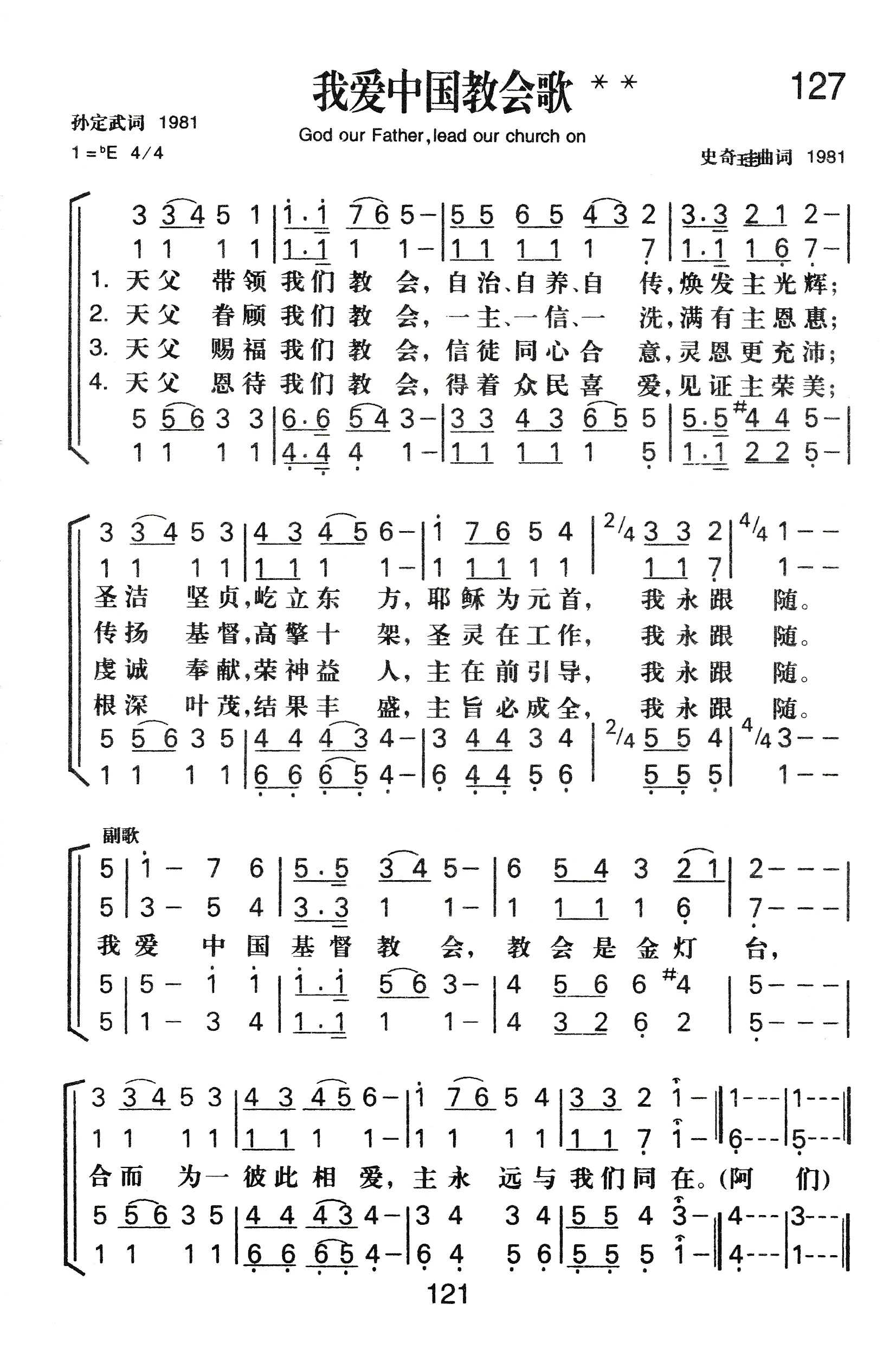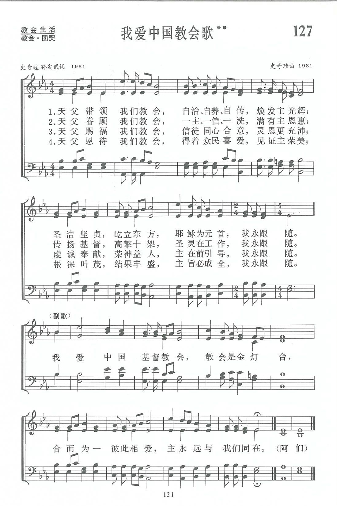 这首诗的曲调采用4 /4进行曲式,唱时使人产生振奋、前进的情绪,形象地表示中国教会在迈进。同时,它仍具有传统赞美诗的格律。特别是副歌“我爱中国基督教会”,这句“爱”字停在最高的“ ”音上面,且延长时值,很能唱出发自内心的真情。