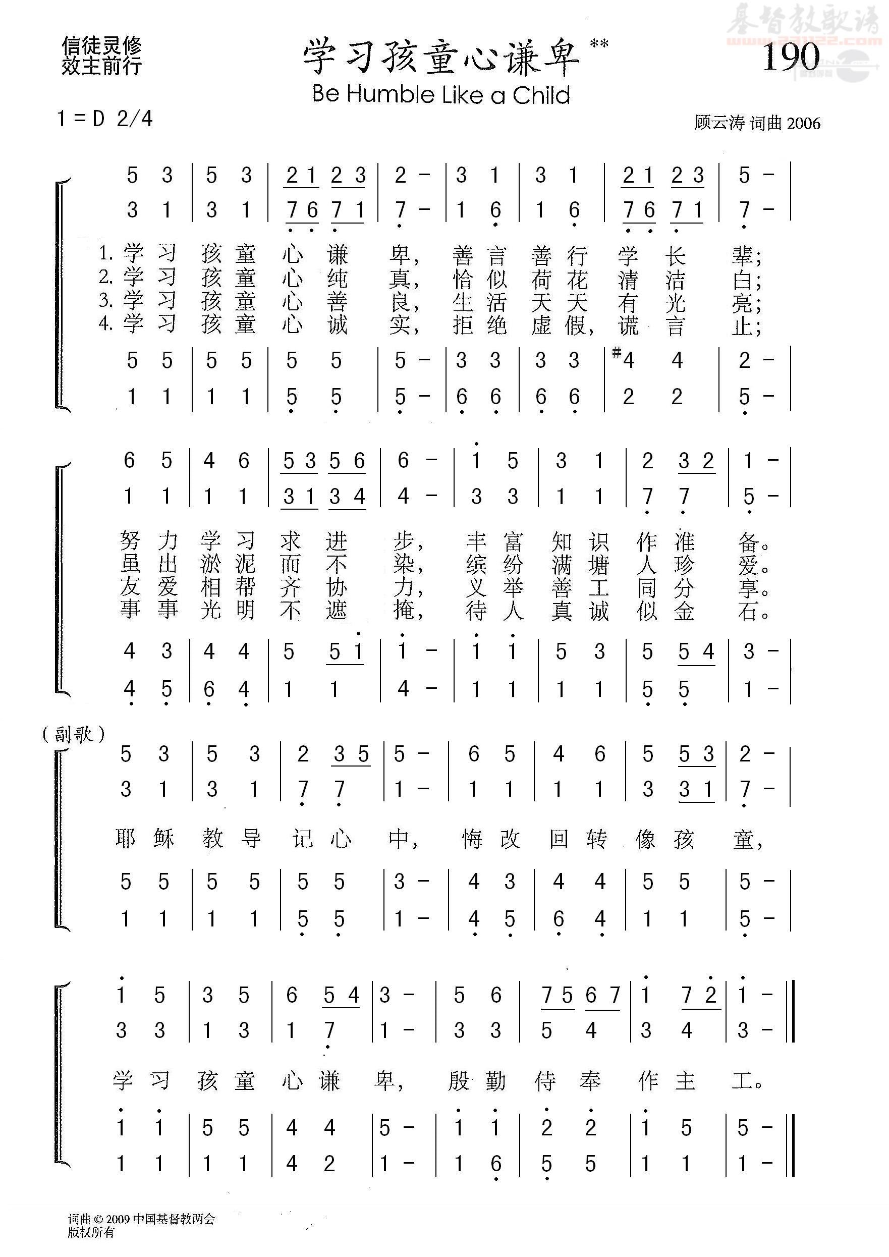 学习孩童心谦卑 《赞美诗(新编)补充本》第190首