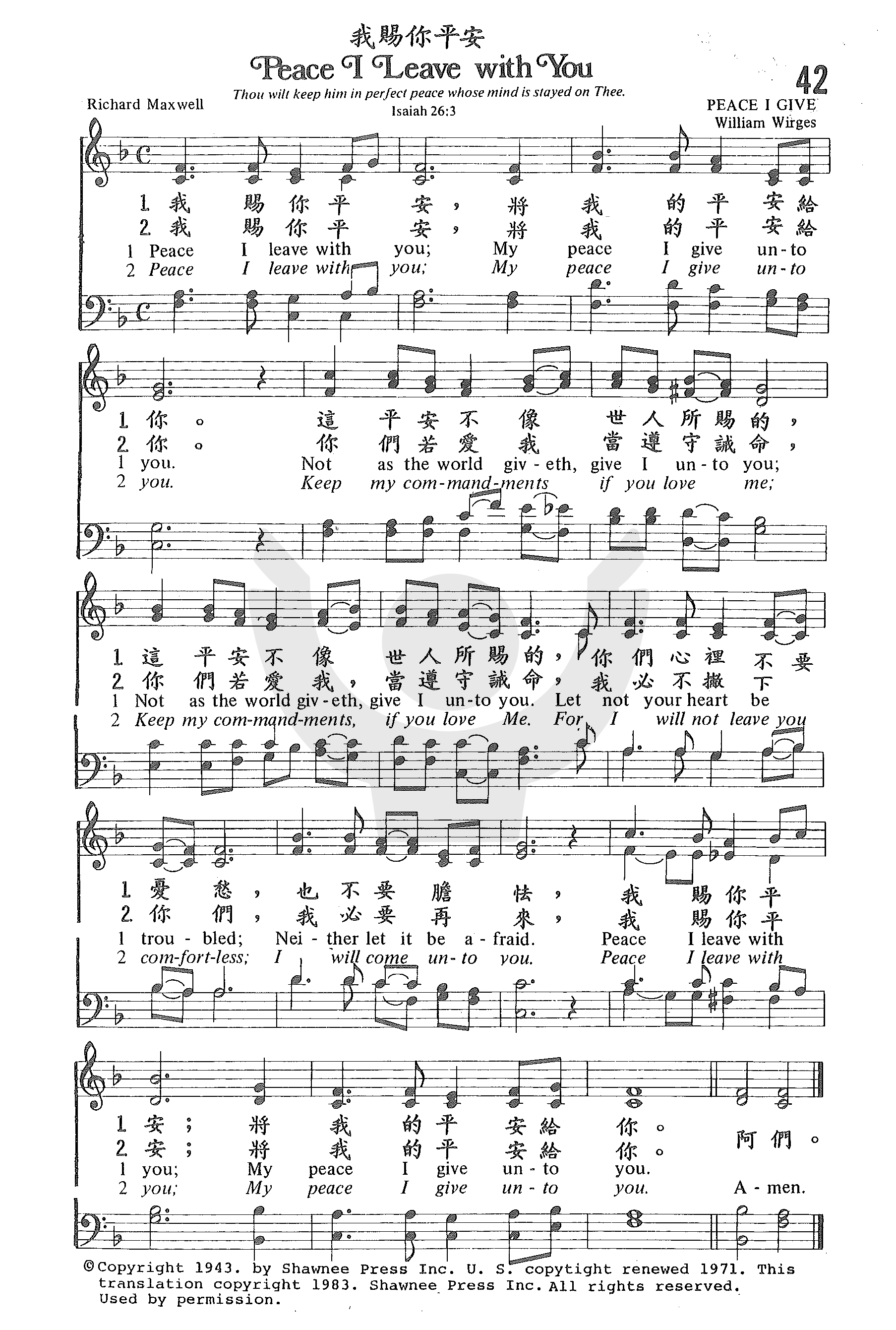 我赐你平安 ( Peace I Leave with You ) 2024年4月22日 作者 Liu, Luke 在线播放和下载: 合唱 四声 https://www.xueshengshi.com/wp-content/uploads/2024/04/20240422_050800.mp3 下载 女高 https://www.xueshengshi.com/wp-content/uploads/2024/04/20240422_050813.mp3 下载 女低 https://www.xueshengshi.com/wp-content/uploads/2024/04/20240422_050811.mp3 下载 男高 https://www.xueshengshi.com/wp-content/uploads/2024/04/20240422_050808.mp3 下载 男低 https://www.xueshengshi.com/wp-content/uploads/2024/04/20240422_050806.mp3 下载 伴奏 四声 https://www.xueshengshi.com/wp-content/uploads/2024/04/20240422_050749.mp3 下载 女高 https://www.xueshengshi.com/wp-content/uploads/2024/04/20240422_050812.mp3 下载 女低 https://www.xueshengshi.com/wp-content/uploads/2024/04/20240422_050810.mp3 下载 男高 https://www.xueshengshi.com/wp-content/uploads/2024/04/20240422_050807.mp3 下载 男低 https://www.xueshengshi.com/wp-content/uploads/2024/04/20240422_050805.mp3 下载 本首圣诗由网上圣诗班 (南京)录制 歌谱:1. 四声五线谱 2. 四声部简谱 简介(一) 《暂缺》 我赐你平安 选自《教会圣诗》第42首 Peace I Leave with You
