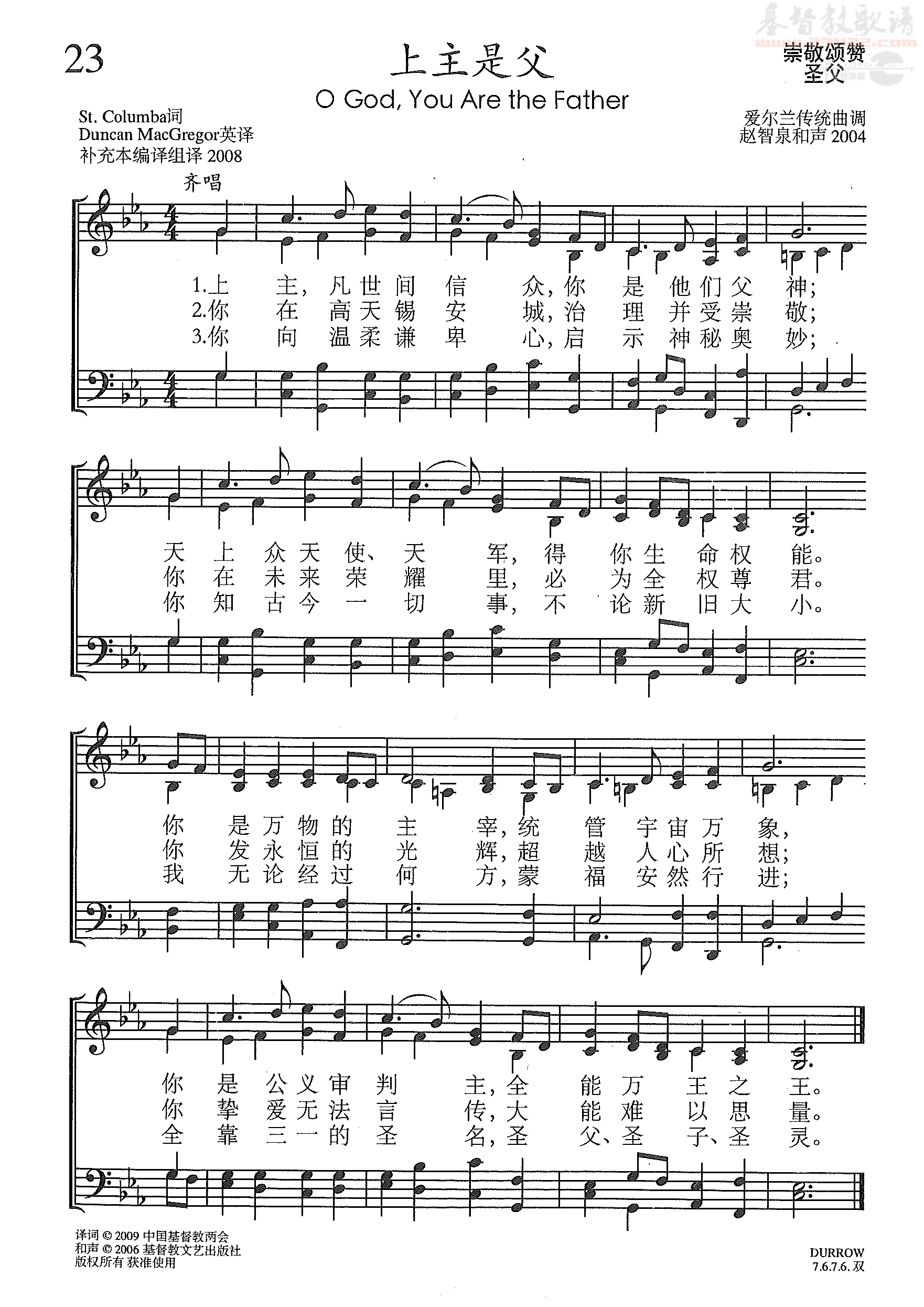 上主是父 (O God, You Are the Father) 2025年1月20日 作者 Liu, Luke 在线播放和下载: 合唱 四声 https://www.xueshengshi.com/wp-content/uploads/2025/01/20250120_030431.mp3 下载 女高 https://www.xueshengshi.com/wp-content/uploads/2025/01/20250120_030345.mp3 下载 女低 https://www.xueshengshi.com/wp-content/uploads/2025/01/20250120_030322.mp3 下载 男高 https://www.xueshengshi.com/wp-content/uploads/2025/01/20250120_030302.mp3 下载 男低 https://www.xueshengshi.com/wp-content/uploads/2025/01/20250120_030242.mp3 下载 伴奏 四声 https://www.xueshengshi.com/wp-content/uploads/2025/01/20250120_030400.mp3 下载 女高 https://www.xueshengshi.com/wp-content/uploads/2025/01/20250120_030335.mp3 下载 女低 https://www.xueshengshi.com/wp-content/uploads/2025/01/20250120_030315.mp3 下载 男高 https://www.xueshengshi.com/wp-content/uploads/2025/01/20250120_030255.mp3 下载 男低 https://www.xueshengshi.com/wp-content/uploads/2025/01/20250120_030232.mp3 下载 本首圣诗由网上圣诗班 (南京)录制 歌谱:1. 四声五线谱 2. 四声部简谱 简介(一) 《赞美诗(新编)补充本》第23首 上主是父 O God, You Are the Father