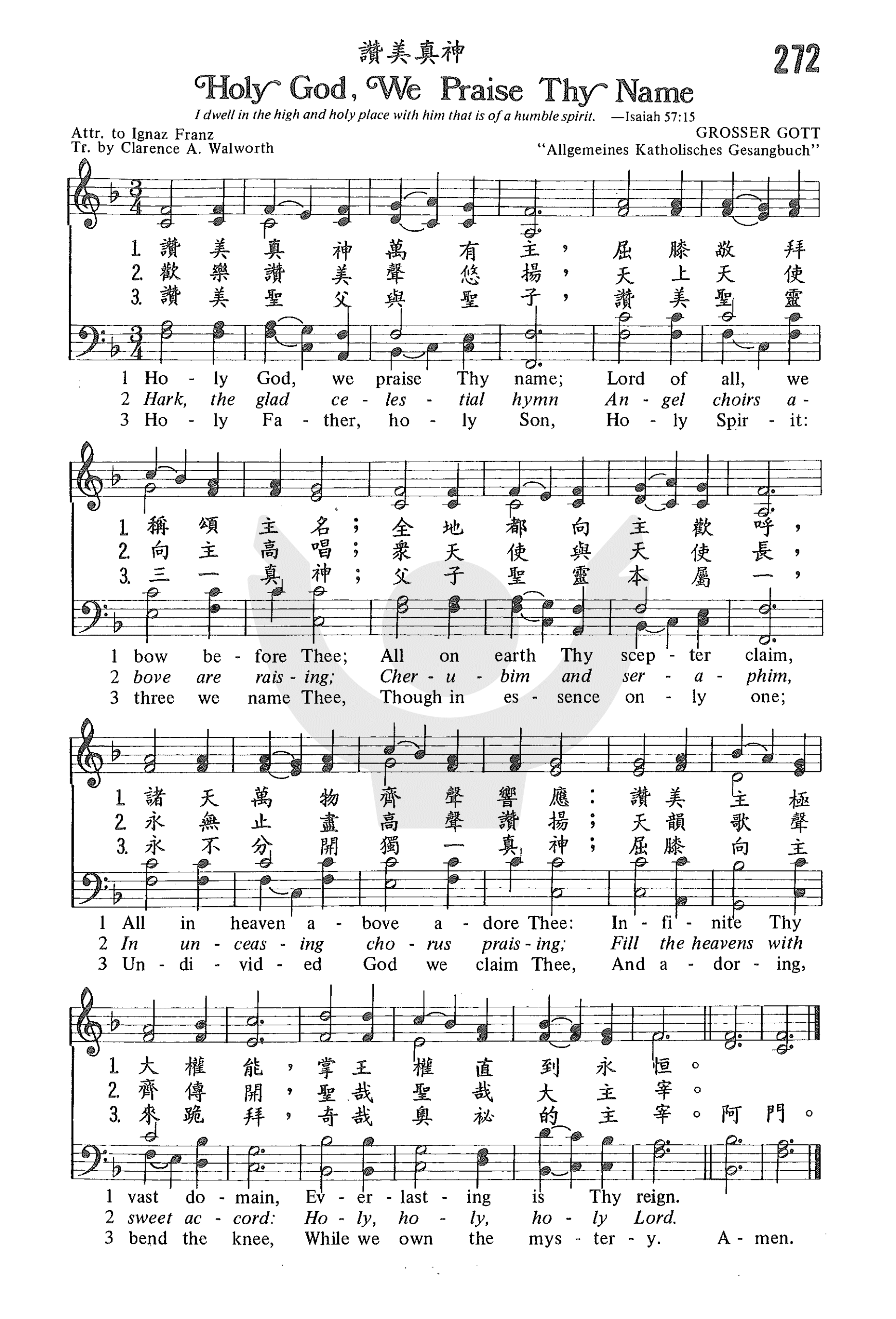 译者:沃尔沃斯,克拉伦斯·阿方索斯(Walworth, Clarence Alphonsus),1820 年出生,1838 年毕业于联合学院,1841 年取得律师资格,学习新教圣公会牧师职务,但随后被任命为罗马天主教牧师,1864 年成为奥尔巴尼圣玛丽教堂的教区牧师。他是美国保禄会的创始人之一。他出版了《温柔的怀疑论者》(纽约,1863 年)和《安迪亚托罗克特》(或圣母节前夕)等(纽约,1888 年)。他对感恩赞的释义“神圣的上帝,我们赞美你的名”,第 1133 页,ii.7,载于《天主教诗篇》,都柏林,1858 年,第 1133 页。 170. 1892年版《美国圣公会赞美诗》中,此诗第二节开头略作修改,为“听,高亢的天籁之音”。本森牧师于1900年逝世。[LF·本森牧师,神学博士]——约翰·朱利安,《赞美诗词典》新补编 (1907年)