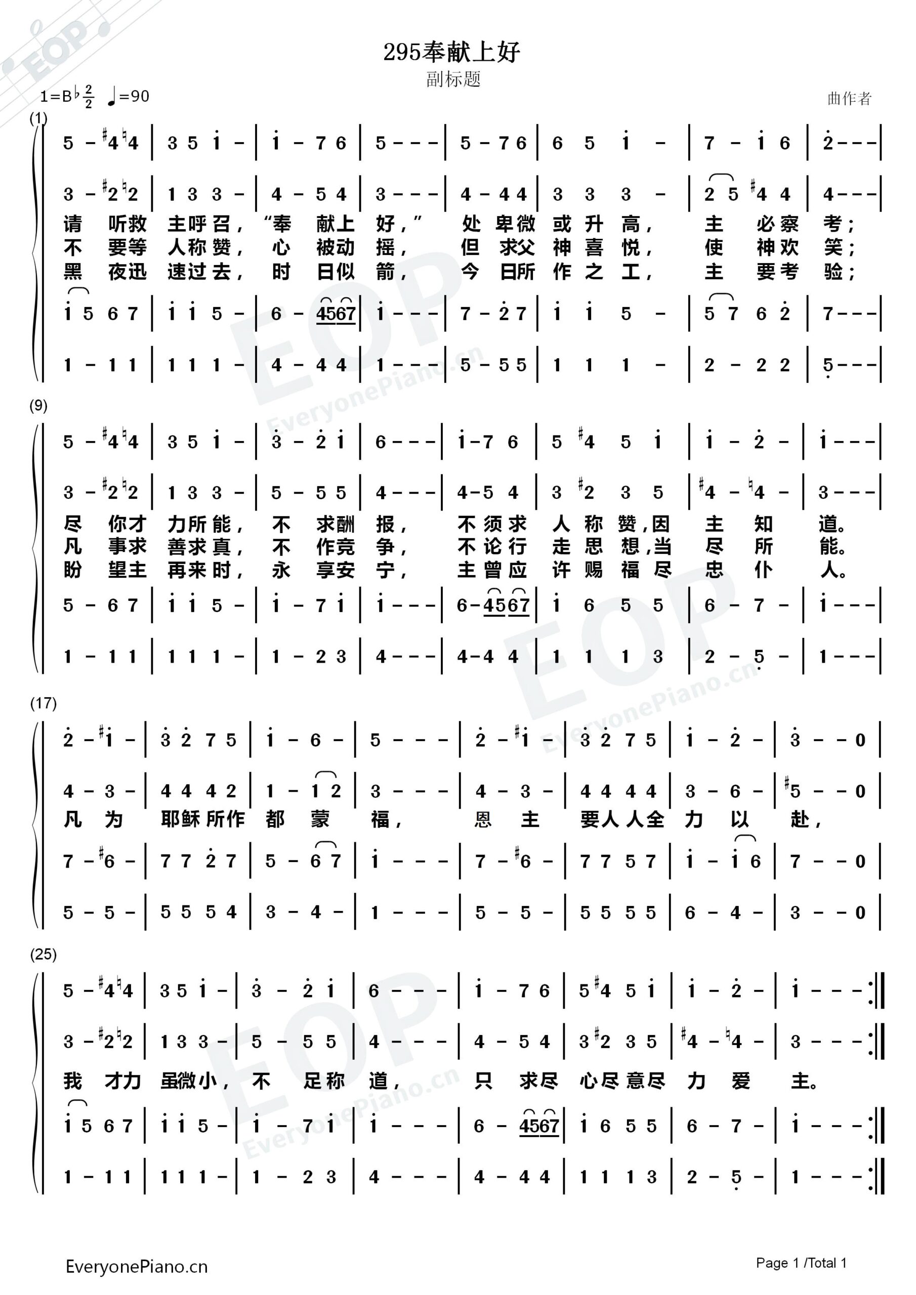 奉献上好 (Our Best) 2025年10月10日 作者 Liu, Luke 在线播放和下载: 合唱 四声 https://www.xueshengshi.com/wp-content/uploads/2025/10/20251009_182054.mp3 下载 女高 https://www.xueshengshi.com/wp-content/uploads/2025/10/20251009_182031.mp3 下载 女低 https://www.xueshengshi.com/wp-content/uploads/2025/10/20251009_182017.mp3 下载 男高 https://www.xueshengshi.com/wp-content/uploads/2025/10/20251009_182006.mp3 下载 男低 https://www.xueshengshi.com/wp-content/uploads/2025/10/20251009_181955.mp3 下载 伴奏 四声 https://www.xueshengshi.com/wp-content/uploads/2025/10/20251009_182038.mp3 下载 女高 https://www.xueshengshi.com/wp-content/uploads/2025/10/20251009_182022.mp3 下载 女低 https://www.xueshengshi.com/wp-content/uploads/2025/10/20251009_182010.mp3 下载 男高 https://www.xueshengshi.com/wp-content/uploads/2025/10/20251009_181959.mp3 下载 男低 https://www.xueshengshi.com/wp-content/uploads/2025/10/20251009_181950.mp3 下载 本首圣诗由网上圣诗班 (南京)录制 歌谱:1. 四声五线谱 2. 四声部简谱 简介(一) 《摘自网页》 奉献上好 选自《教会圣诗》第295首 Our Best 作者:出生:约1847年,宾夕法尼亚州费城附近。逝世:约1917年,宾夕法尼亚州费城。柯克作品包括:《沿途的沉思》