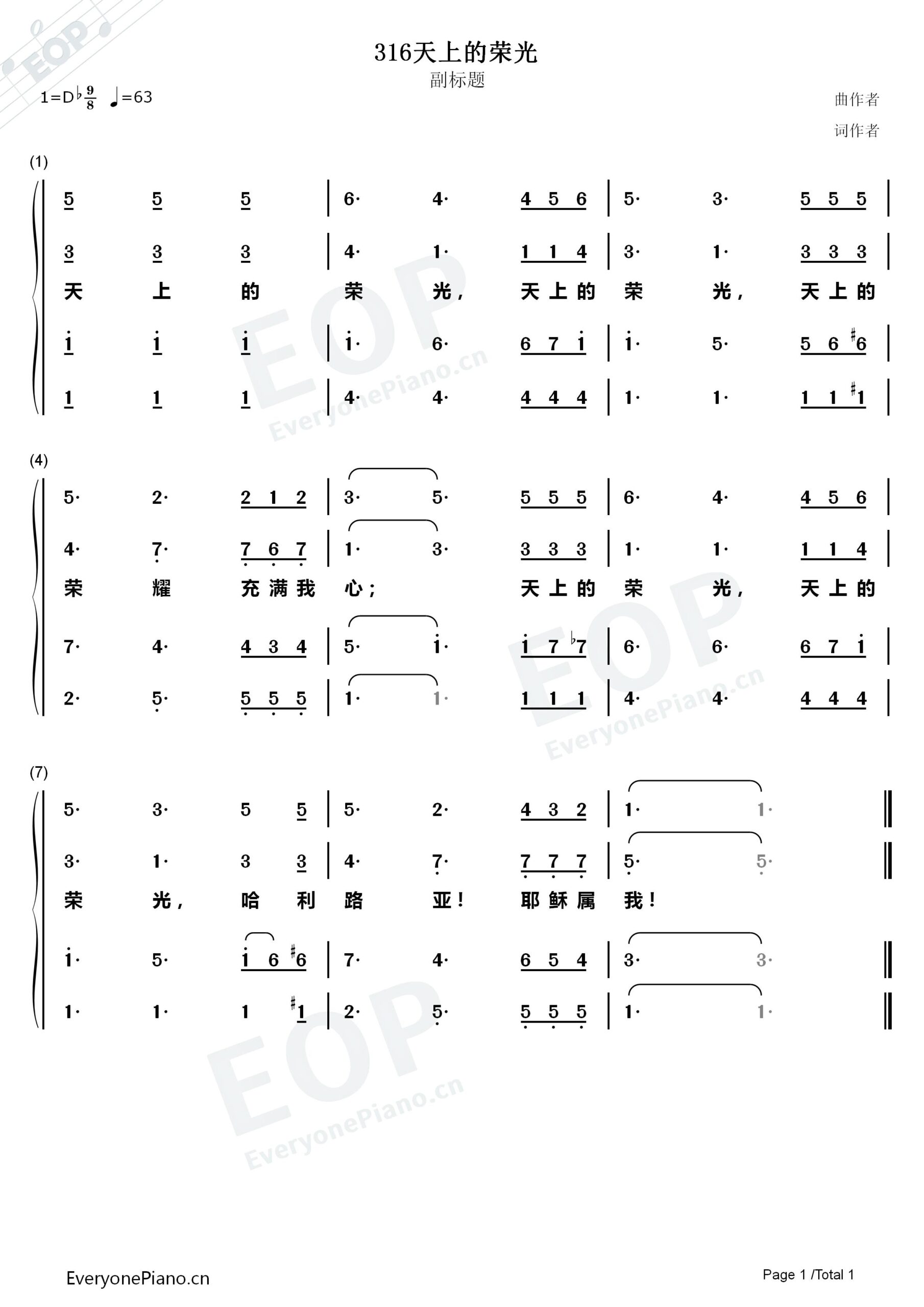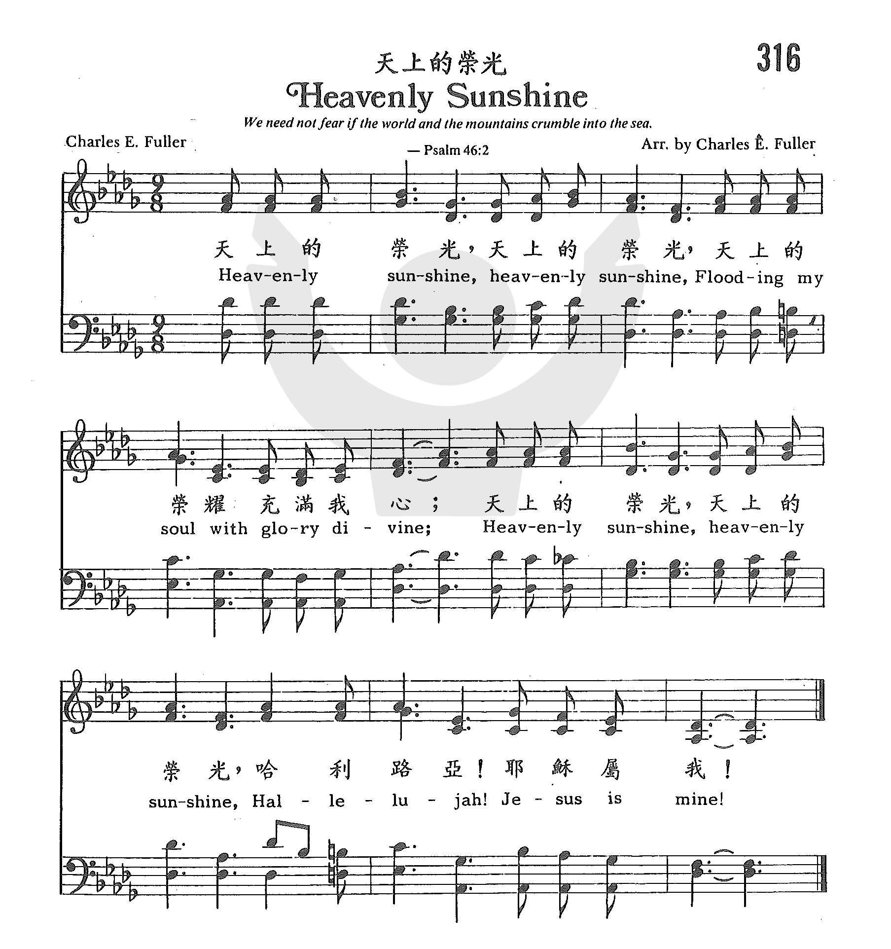 天上的荣光 (Heavenly Sunshine) 2026年1月9日 作者 Liu, Luke 在线播放和下载: 合唱 四声 https://www.xueshengshi.com/wp-content/uploads/2026/01/20260109_012137.mp3 下载 女高 https://www.xueshengshi.com/wp-content/uploads/2026/01/20260109_012117.mp3 下载 女低 https://www.xueshengshi.com/wp-content/uploads/2026/01/20260109_012113.mp3 下载 男高 https://www.xueshengshi.com/wp-content/uploads/2026/01/20260109_012107.mp3 下载 男低 https://www.xueshengshi.com/wp-content/uploads/2026/01/20260109_012103.mp3 下载 伴奏 四声 https://www.xueshengshi.com/wp-content/uploads/2026/01/20260109_012124.mp3 下载 女高 https://www.xueshengshi.com/wp-content/uploads/2026/01/20260109_012115.mp3 下载 女低 https://www.xueshengshi.com/wp-content/uploads/2026/01/20260109_012110.mp3 下载 男高 https://www.xueshengshi.com/wp-content/uploads/2026/01/20260109_012105.mp3 下载 男低 https://www.xueshengshi.com/wp-content/uploads/2026/01/20260109_012101.mp3 下载 本首圣诗由网上圣诗班 (石家庄一组)录制 歌谱:1. 四声五线谱 2. 四声部简谱 简介(一) 《摘自网页》 天上的荣光 选自《教会圣诗》第316首 Heavenly Sunshine 作者:富勒,查尔斯·爱德华(Fuller, Charles Edward),1887-1968. 牧师兼广播福音布道先驱,富勒神学院创始人