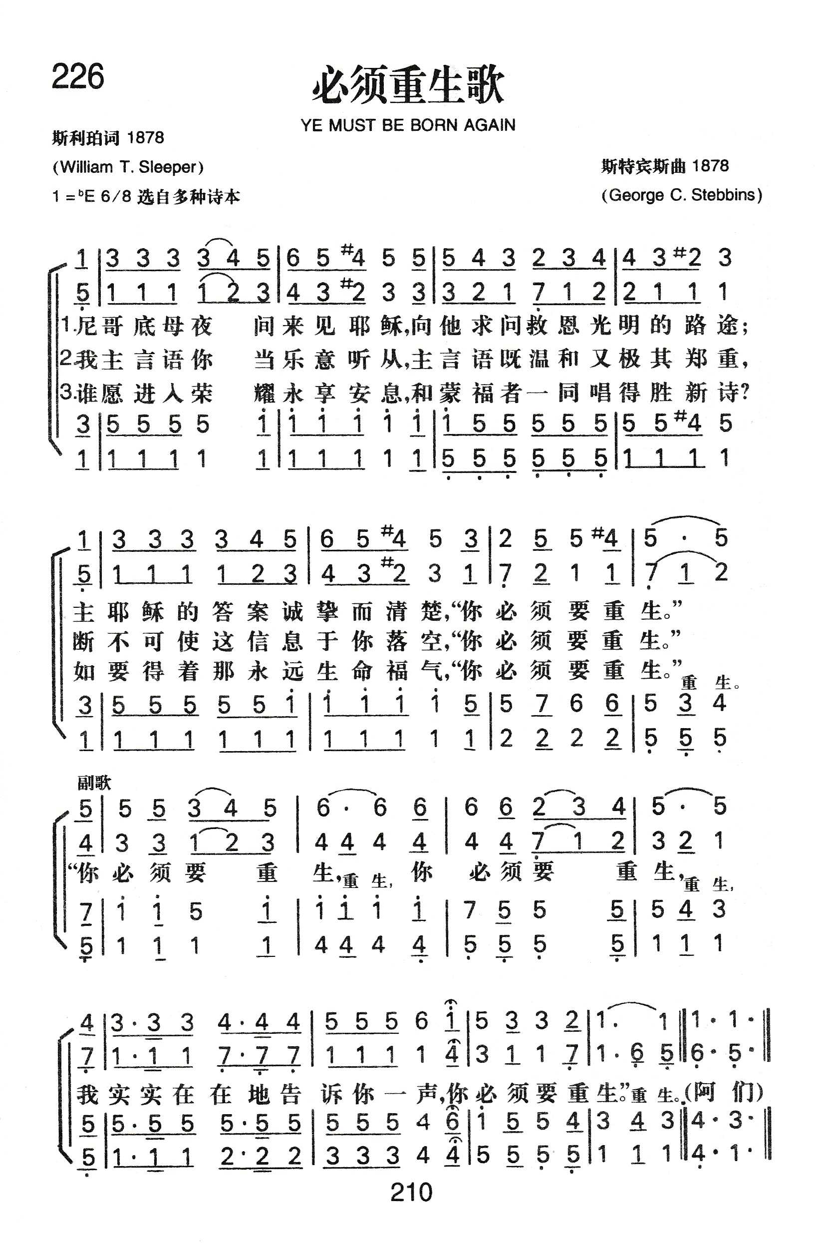 这首诗是斯利珀 (W.T.Sleeper,18l9一l904)作词。原诗第一句为“有一个官晚上来见耶稣”,汉译直接点出这个官的名字:“尼哥底母夜间来见耶稣”。