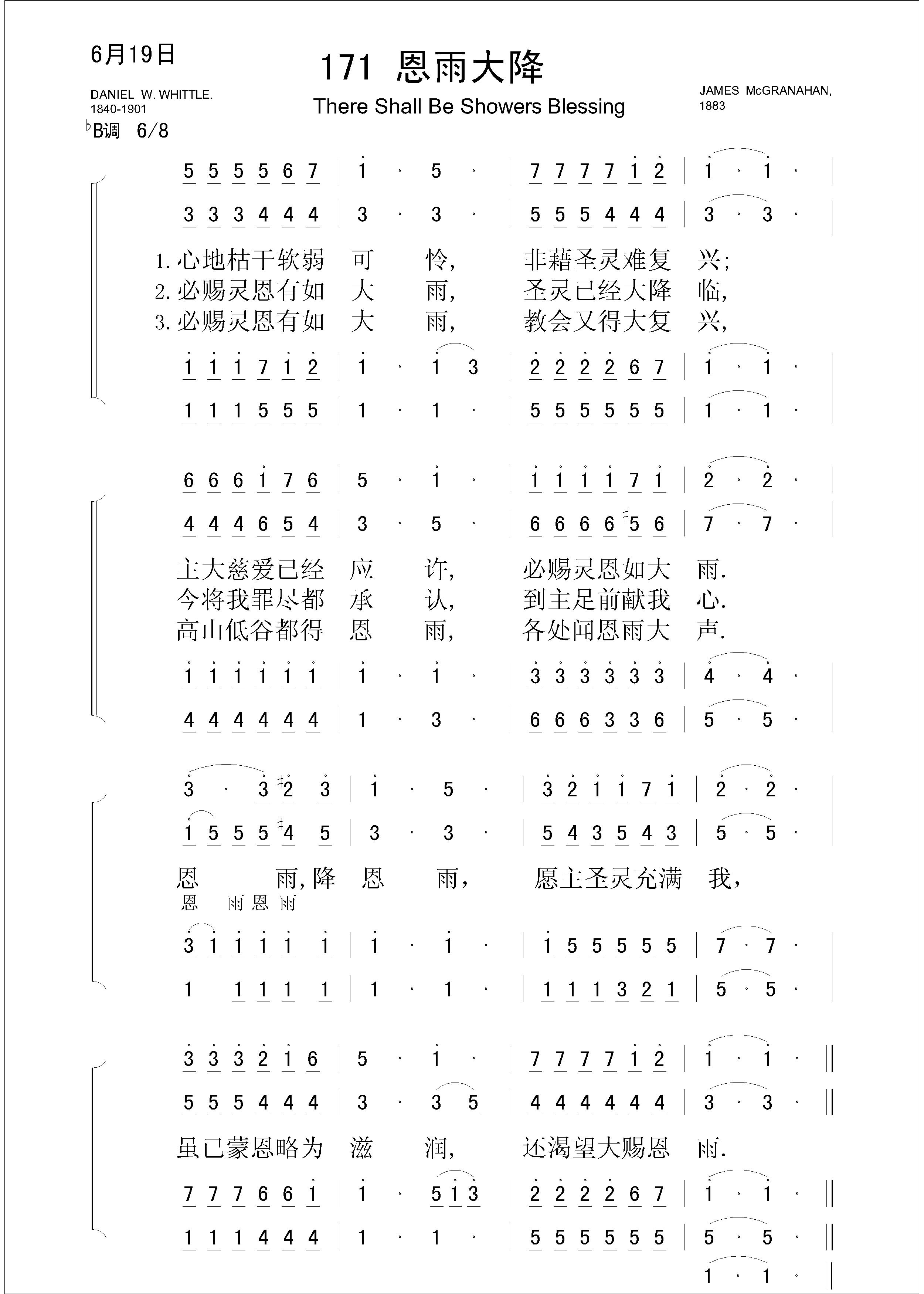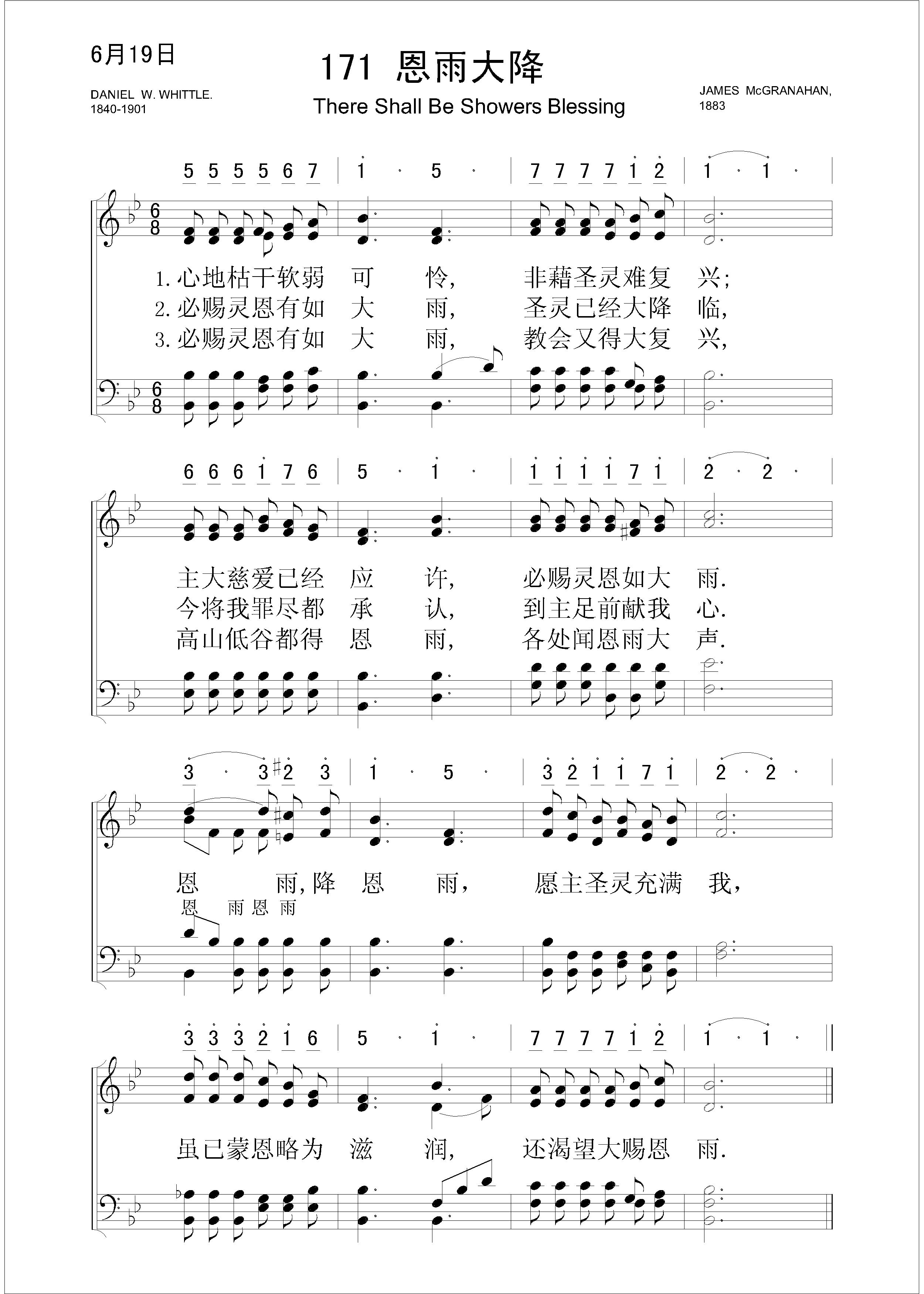 这首「恩雨大降」即是两人合作成果。作曲者 James McGranaham 系 1840 年 7 月生于宾州,是擅长男高音之歌手,但将恩赐为主使用。本诗最早发表于 1883 年出版的福音圣诗第 4 首。