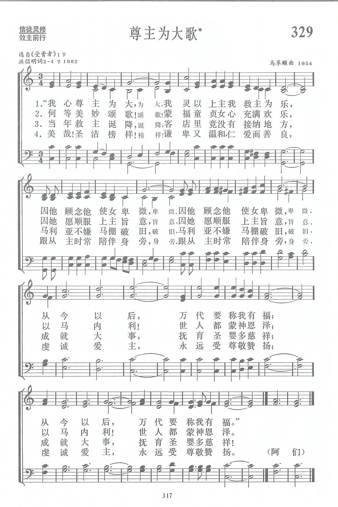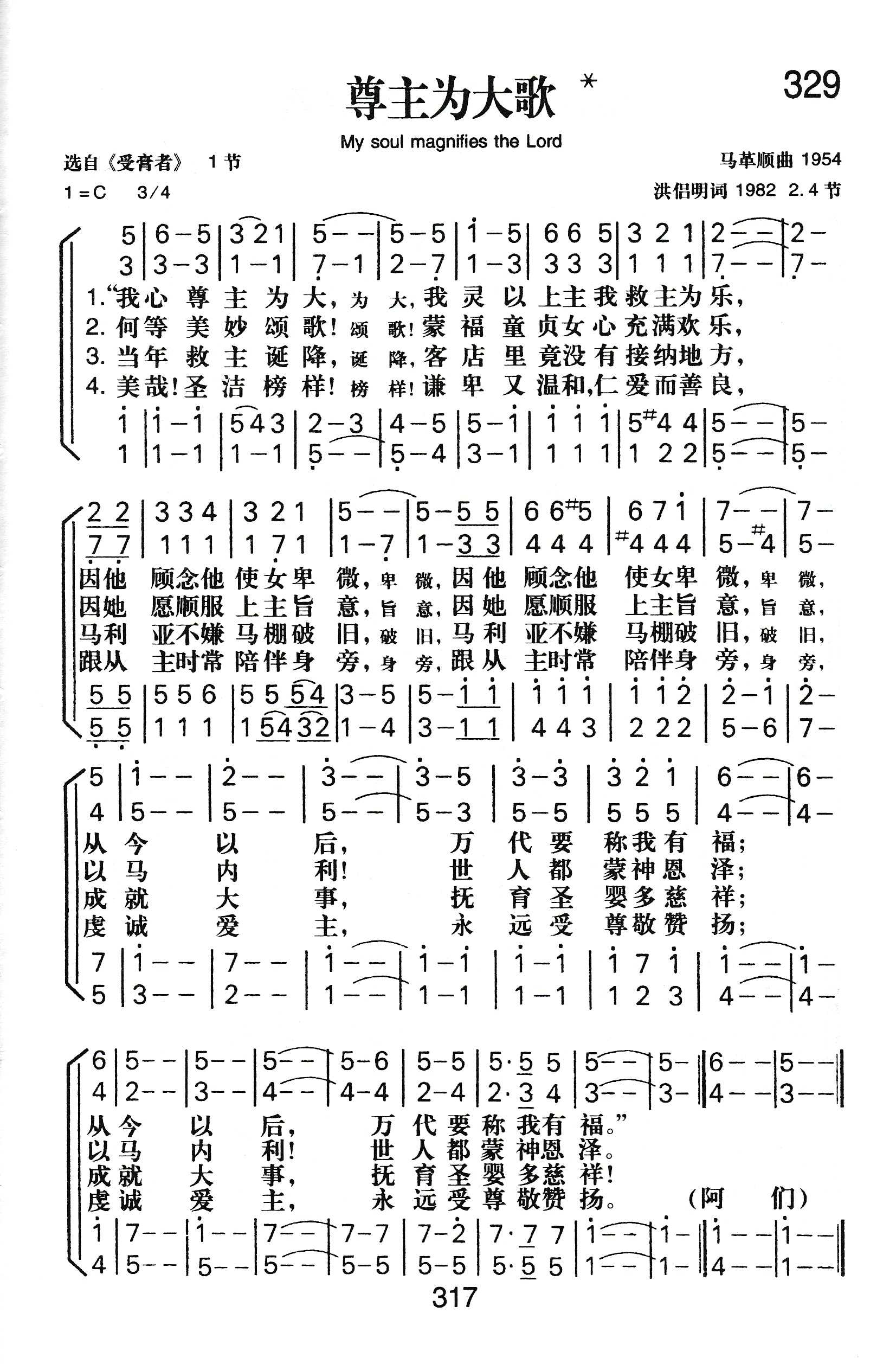《我心尊主为大》原来只有一节。《新编》编辑部的洪侣明同工(简历参阅第45首)读了这首诗的改编稿以后,想到如能多有几节,必将有助于信徒学习马利亚的美好榜样。她征得作者同意,按曲调进行的要求,增写了第二至四节,细腻地刻划了马利亚如何存心顺服,在马棚里成就了大事。特别是第四节,把马利亚爱主、跟从主、陪伴主的形象予以重现,使唱的人都受到激励。