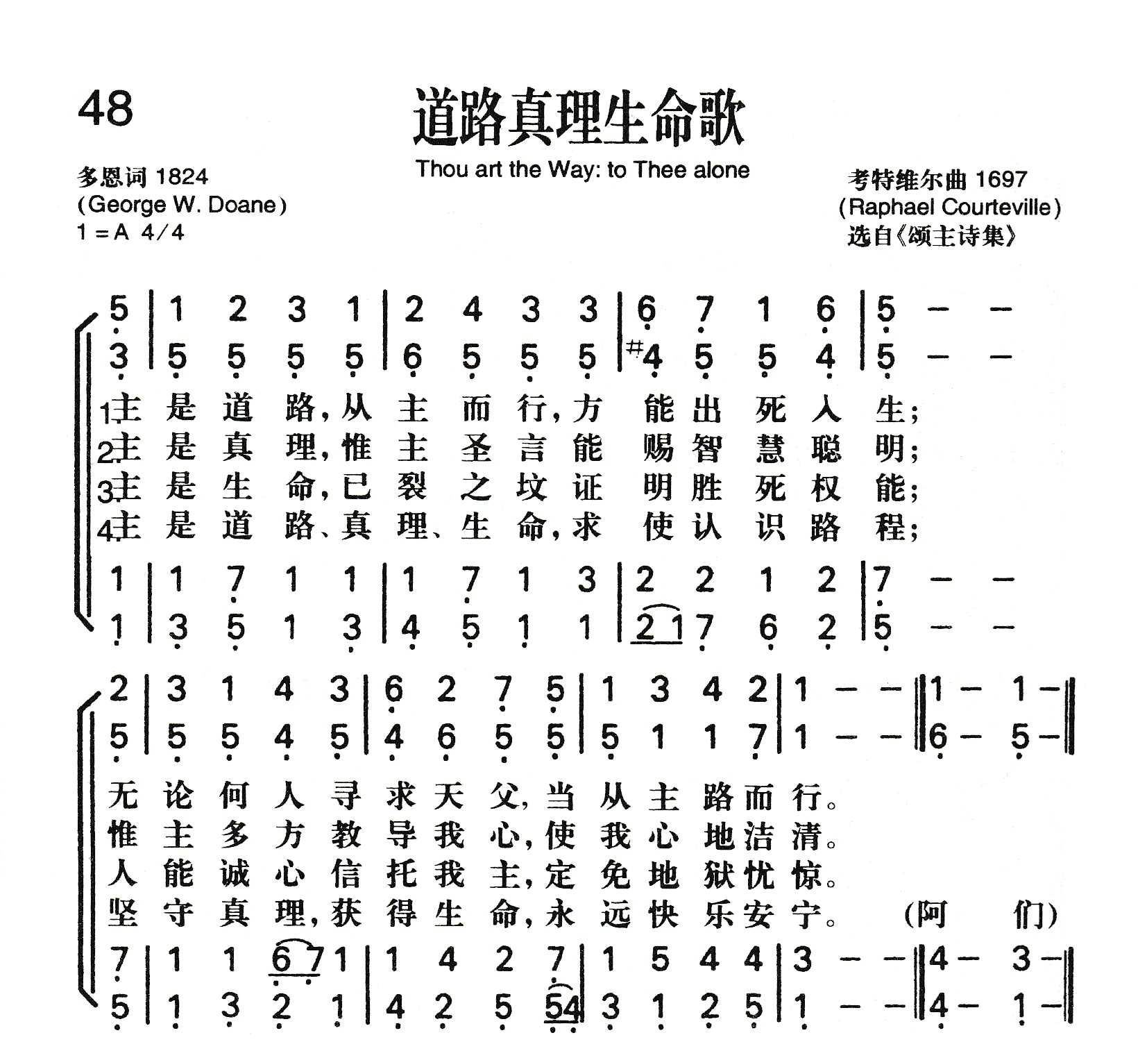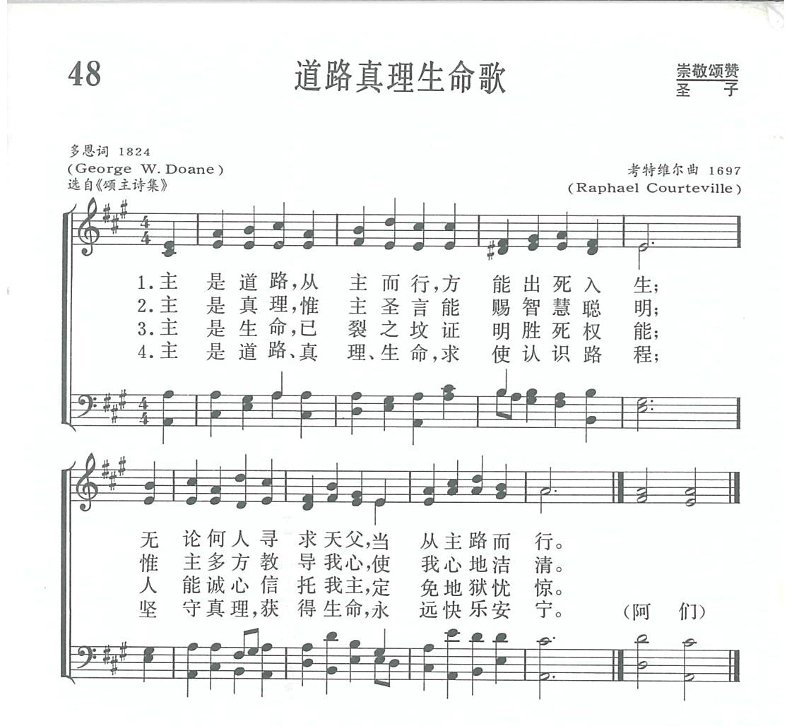 这首 《道路真理生命歌》,是根据耶稣说“我就是道路、真理、生命,若不藉着我,没有人能到父那里去”(约14:6)写的一首经文圣诗。全诗共四节,首三节分别叙述:主耶稣是我们寻求天父的惟一道路,主耶稣是我们惟一寻求的真理,主耶稣是我们惟一永恒的生命。第四节总结主乃道路、真理、生命,使我们认识道路,坚守真理,获得生命,永远快乐安宁。