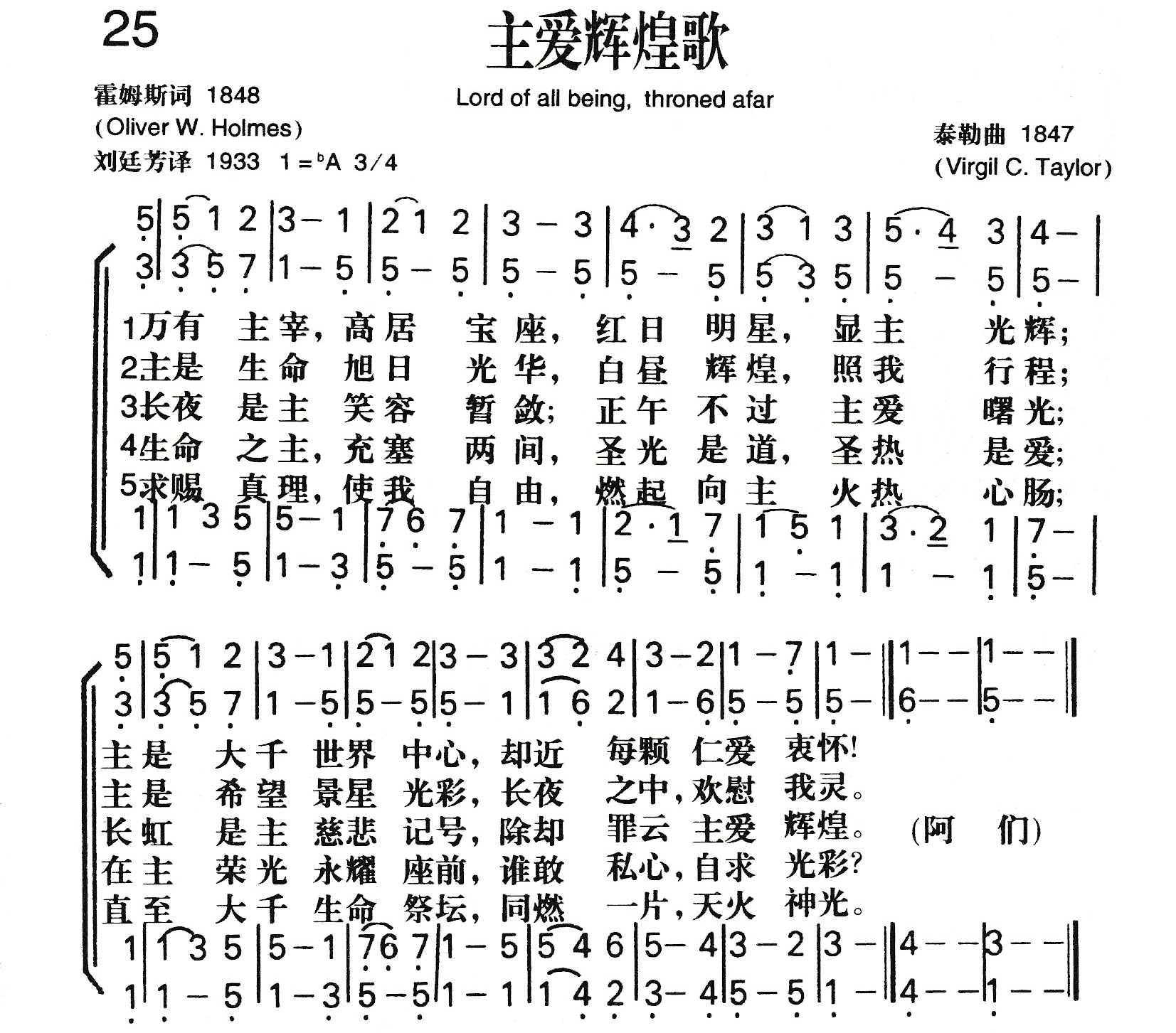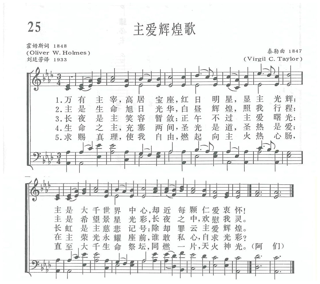 作者霍姆斯 (O.W.Holmes,1809— 1894)乃美国近代著名的解剖学教授、诗人和文学家,在哈佛大学毕业后进医学院,以后当过医生,留学欧洲,返国后任住院医师。他在哈佛大学读书时即以诗文闻名,曾为母校校庆写了纪念的诗歌。虽然医学是他的专业,但写作是他的业余爱好,而且在文坛上已享有盛名,与当代美国诗人、文豪都交往甚密。他曾发起创办《大西洋》杂志(月刊),并且自己积极写稿。1859年他在该刊上发表了一系列连载的散文,题为《教授在早餐桌前》;第12期刊登这篇文章的最后部分。结束之前他写道:“回顾一年的记载,这位‘教授’要求那些曾被文章所载而心里感到惶惑的人,能以心平气和下来,并且温和地要求读者们忘记眼前对于真理的不同见解, (因为人们总是以不同的有色眼镜来看待真理)而联合起来与我们从心里同唱下列这一首诗,共同赞美领导我们的光明之源。我们都需要这个光明来领导我们,因为只有这光的温暖能使我们成为弟兄。”接着便是这首诗,也就是全文的结束。原题为《一个星期日的圣诗》: