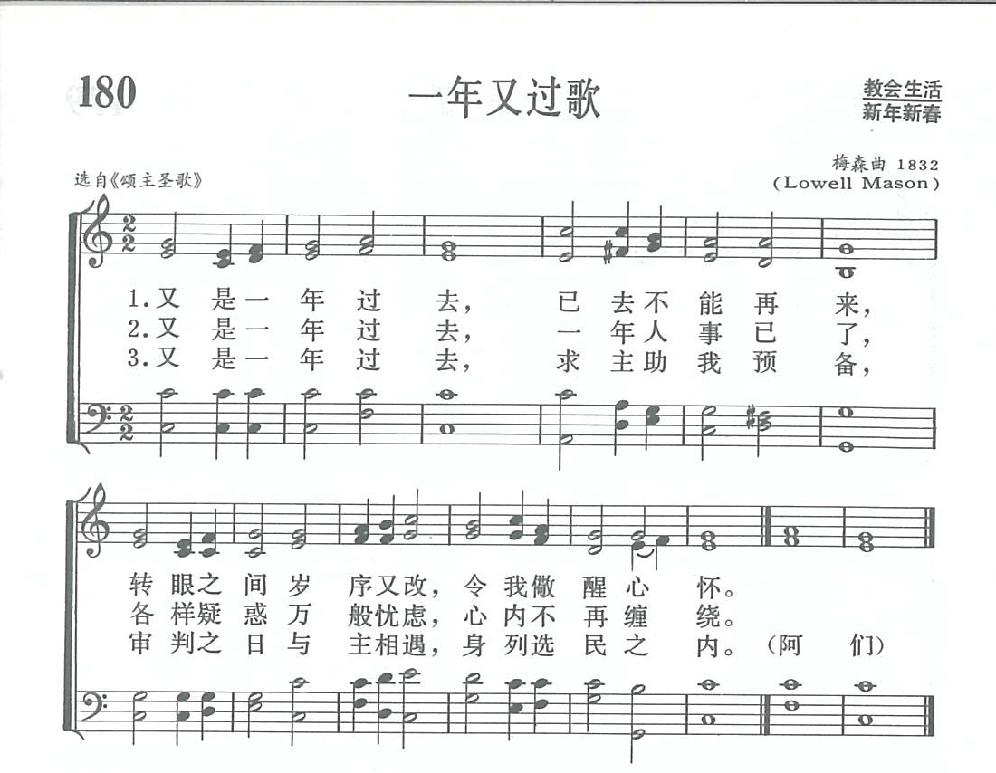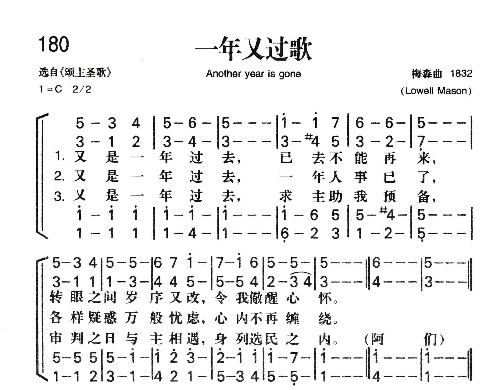 这首《一年又过歌》约作于 1918年,内容含义很好,但词句欠雅致,所以选人其它圣诗时都稍有修正,原诗共五节,选入 内地会《颂主圣歌》时,第四节为: