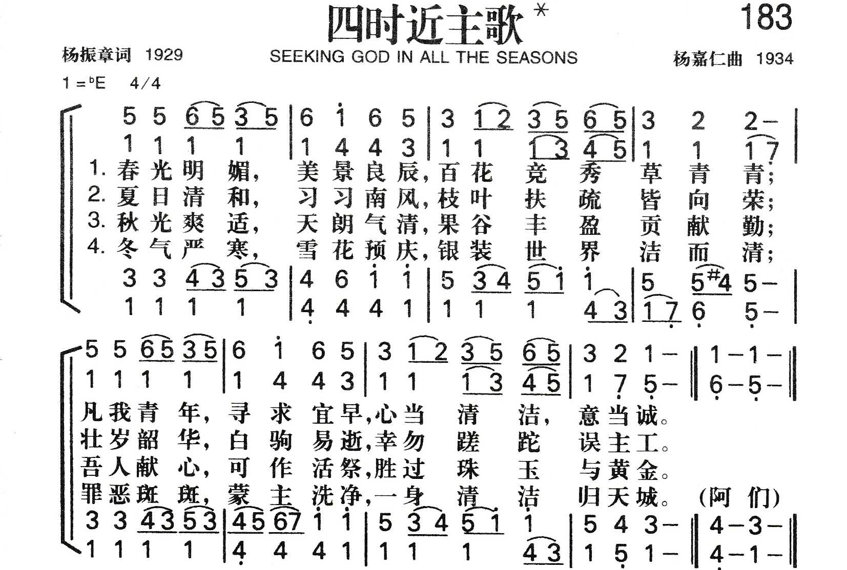 这首诗由杨嘉仁教授配以具有中国音乐特点的曲调《四时》。杨嘉仁 (1912一1966)广东中山县人,作曲时是位22岁的青年。他是金陵女子大学音乐系惟一男性毕业生,以后留学美国,回国后历任各大学和上海音专教授。1956年起任上海音乐学院指挥系主任,是我国有名的指挥家。他曾为《普天颂赞》作了两首曲调,除这首《四时》外,还有一首《上寿》( 《普天颂赞》(旧版)第431首)。“文革”期间,杨嘉仁不幸受迫害致死。