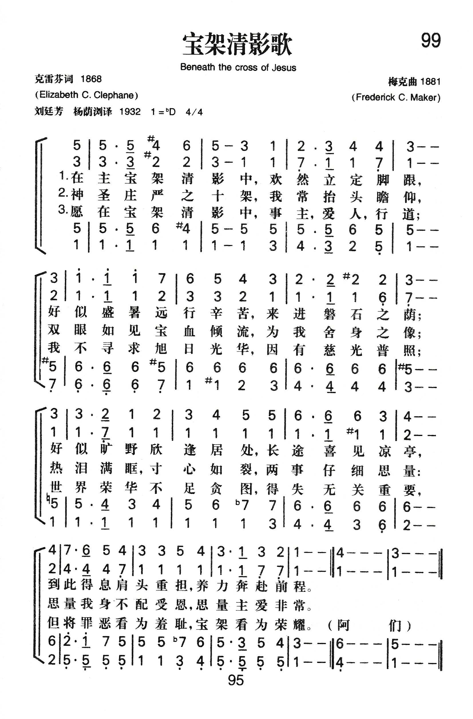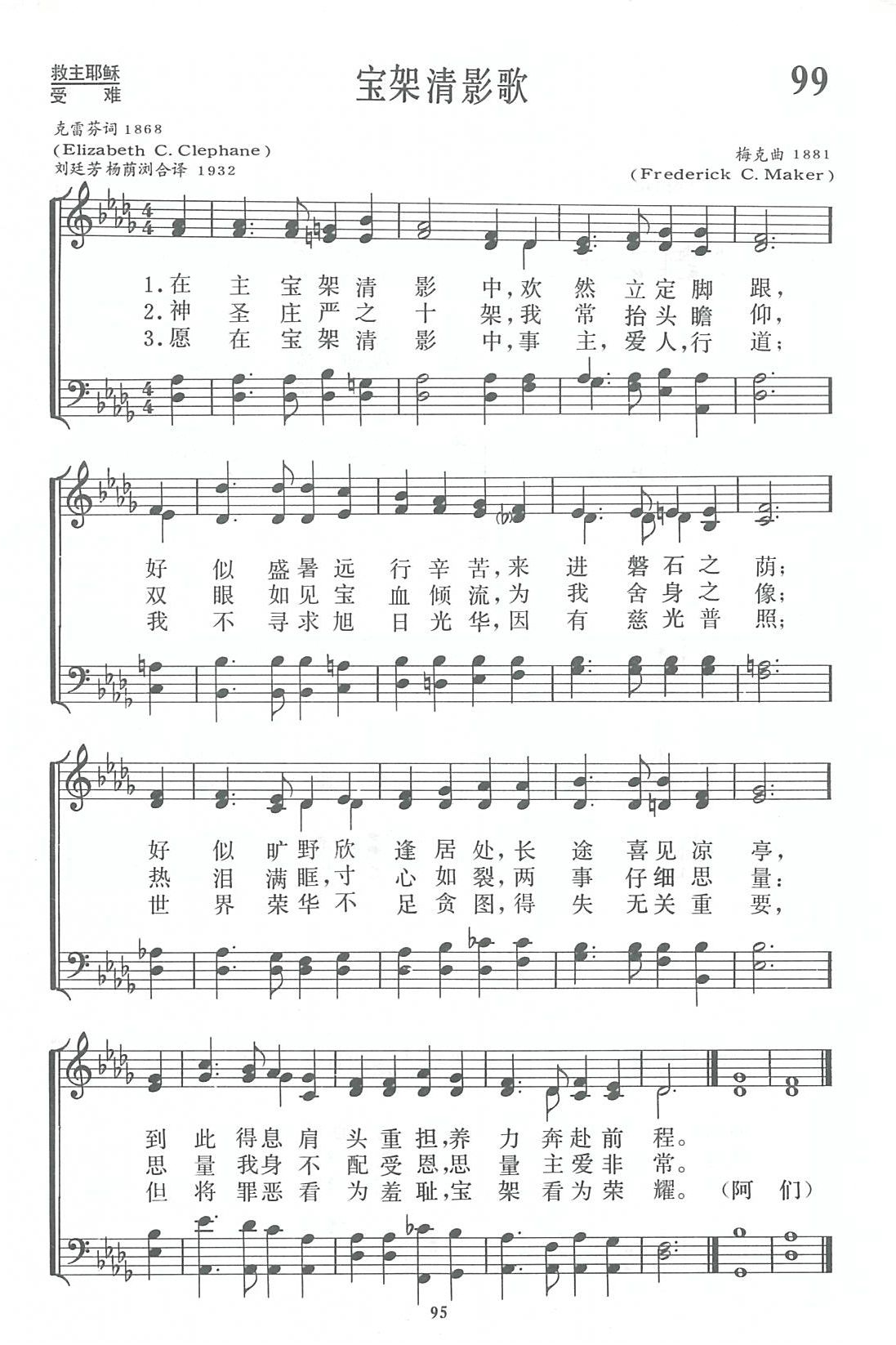 这首诗的曲调名叫《圣克利斯朵夫 (ST.CHRISTOPHER)》,是英国著名音乐家梅克 (F.C.Maker,1844一1927)所谱。梅克出生于英国布里斯托尔地方,是圣公会信徒,自小就在该地主教座堂参加唱诗班,开始他的音乐生涯;及长以他的音乐才华也帮忙该地几个非国教教会礼拜堂的圣乐工作,在公理会 (见第25首注①)教堂任琴师28年,并任当地音乐学院的兼职教授和教会联合会的圣乐指挥。除作圣诗曲调外,他还谱写了若干大型乐谱、教会乐章、钢琴乐谱如一首康塔塔①《摩西在荊棘丛中》等,使这位从来没有离开过布里斯托尔地方的人,却能名扬四海,得到了信徒和音乐爱好者的钦佩。他的诗谱选入《新编》的有第99、198二首。