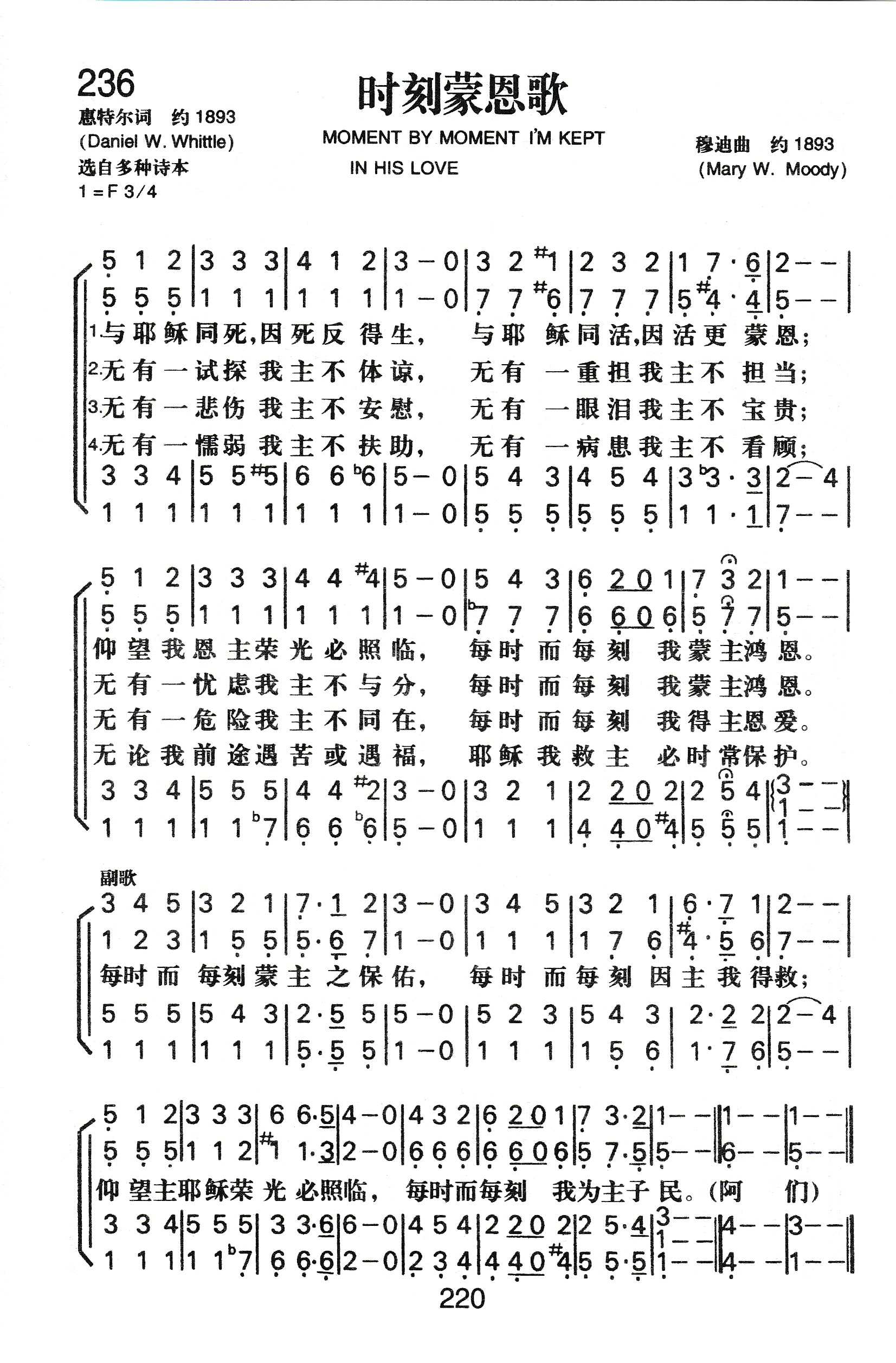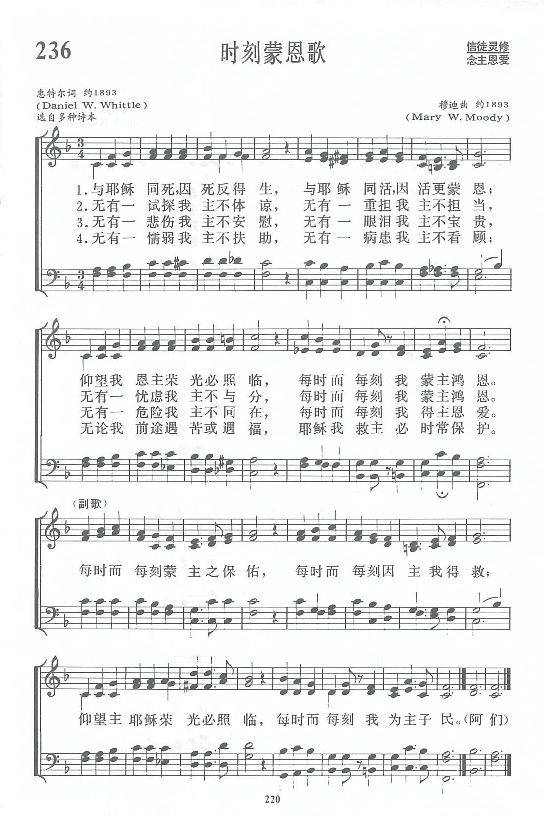 有一次,在美国芝加哥城召开世界贸易大会时,举行了宗教集会,会众同唱《我时刻需要主》。这时有一位从英国来的平信徒对惠特尔 (事略参阅第206首)说,我想这首诗表达的意思还不够确切,因为他只说我时刻需要主 (英文原意为:我每小时都需要主 I need Thee every hour),这太不够了,岂止是每小时,而是每秒每分,时时刻刻须臾不可离主。惠氏听到后,虽然口头上说,时刻需要主即含有随时之意,但思想上也觉得这位信徒所说的不无道理。当即集中思想另写了这首《时刻蒙恩歌》,首句为“与耶稣同死,因死反得生,与耶稣同活,因活更蒙恩”(也有译作:“与基督同死,主死算为我,与基督同活,我得新生命”)。接着说无论是在试探、悲伤、软弱的时刻里,每时每刻都有主的同在与恩佑。这首诗后来又传到英国,由英国又传到南非,并且传遍了世界各地。它的歌名又叫《每时每刻》或译作《时时刻刻 (MOMENT BY MOMENT) 。