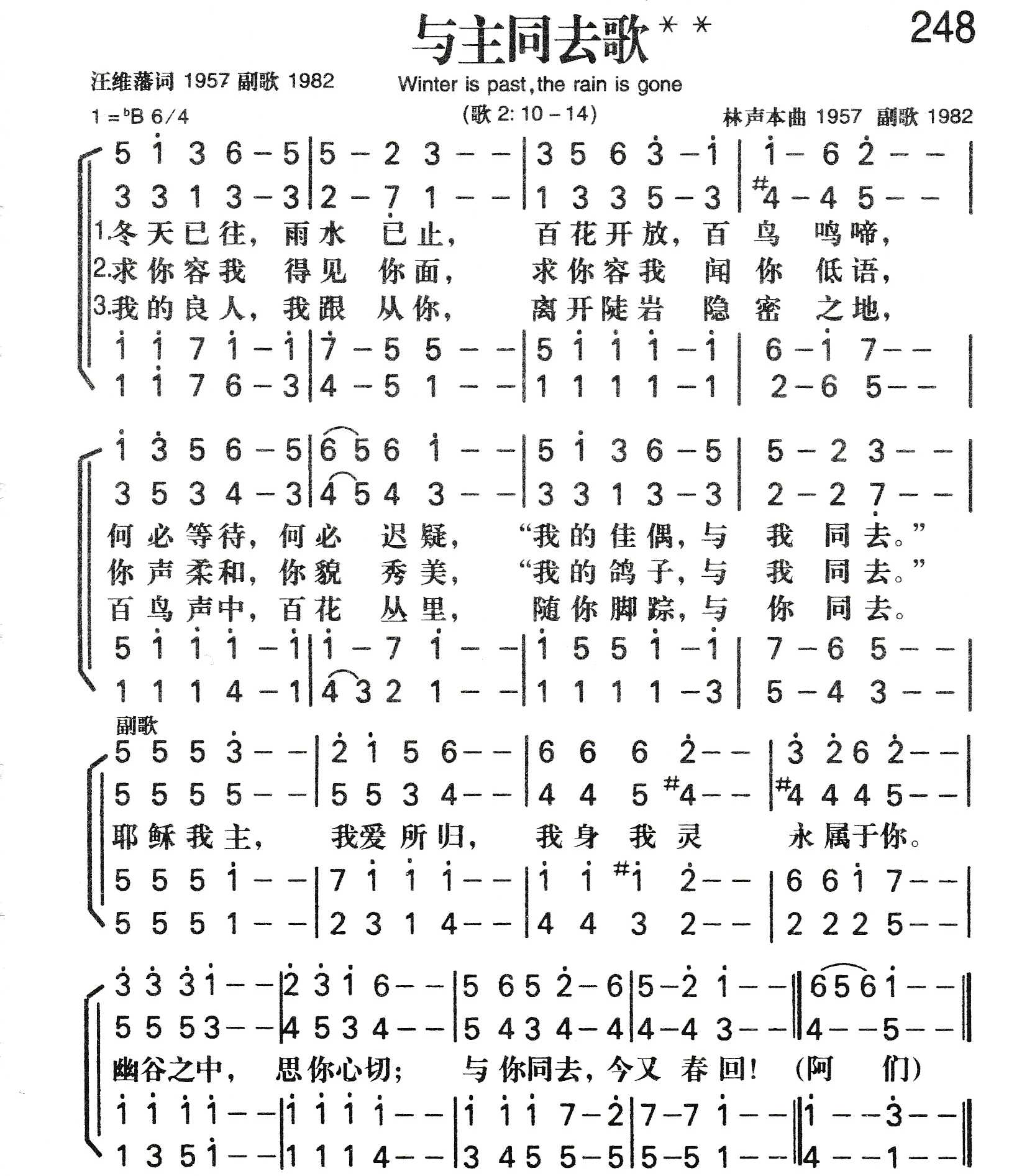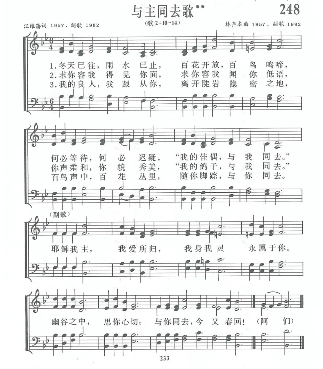 这首诗原名《雅歌》,写于 1957年春,共三节,每节四句,没有副歌。前两节是主的召唤,后一节是作者自己的回应。汪维藩与林声本是神学院里的同学,也是好友,当时便是他们合作词曲。原诗发表于《圣光)1957年第三期,紧接于蒋佩芬同工根据同一段圣经所写的讲章之后。但这首诗那时在教会内并未广泛使用,却被选入苗文圣诗集。