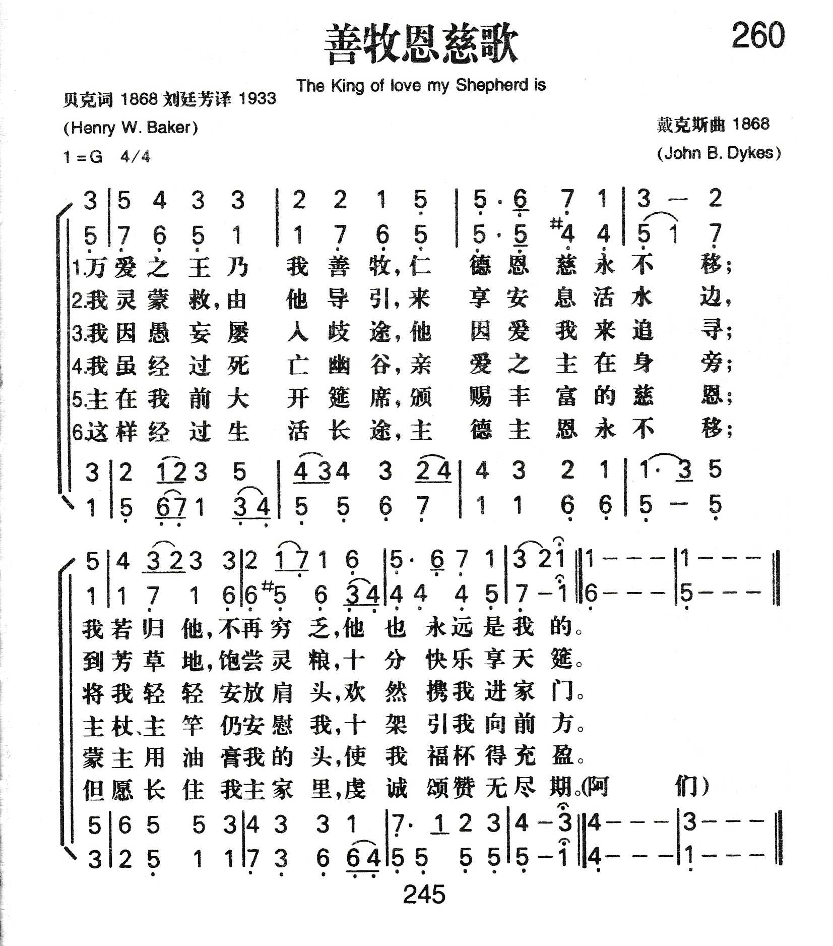 贝克将基督乃善牧的形像 (约l0:1—5,11、14一18)以及约翰所载救主乃神大爱的化身 (约15:9一l 4;约壹4:8一11)天衣无缝地结合到他的诗中来。如称耶和华为“万爱之王”,称“耶和华的殿”为“我主家里”等等。该诗三、四两节更具体表现善牧耶稣与信徒的密切关系。他在弥留之际,仍不断低声默吟: