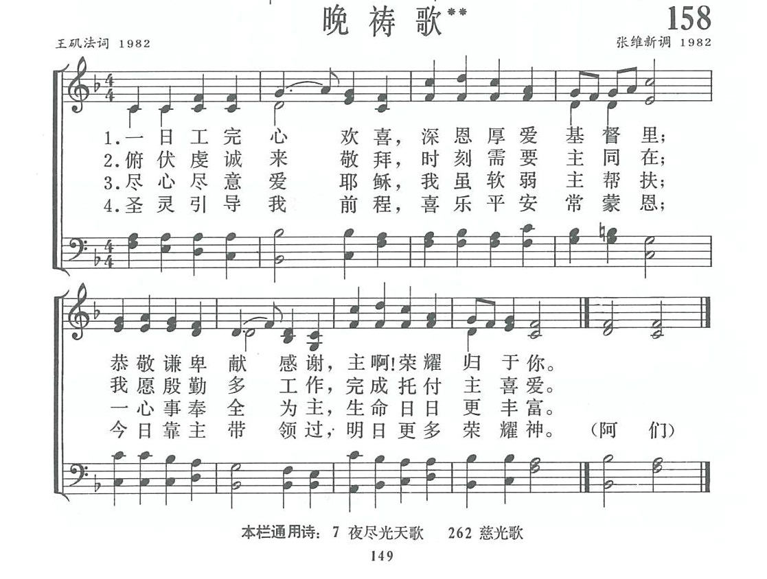 王矶法的《晚祷歌》写成以后,编辑部同工曾征集到四个配曲,有的也不失其为佳作。考虑到张维新是一位普通的农民信徒,已经在教会中为圣诗创作,脚踏实地的作了努力,而且这个曲调也是为晚祷诗歌而作的,反映出相似的灵性意境,因此决定还是选上这首曲。它的进行简单朴素,所表达的是对神真诚的依赖与信靠。
