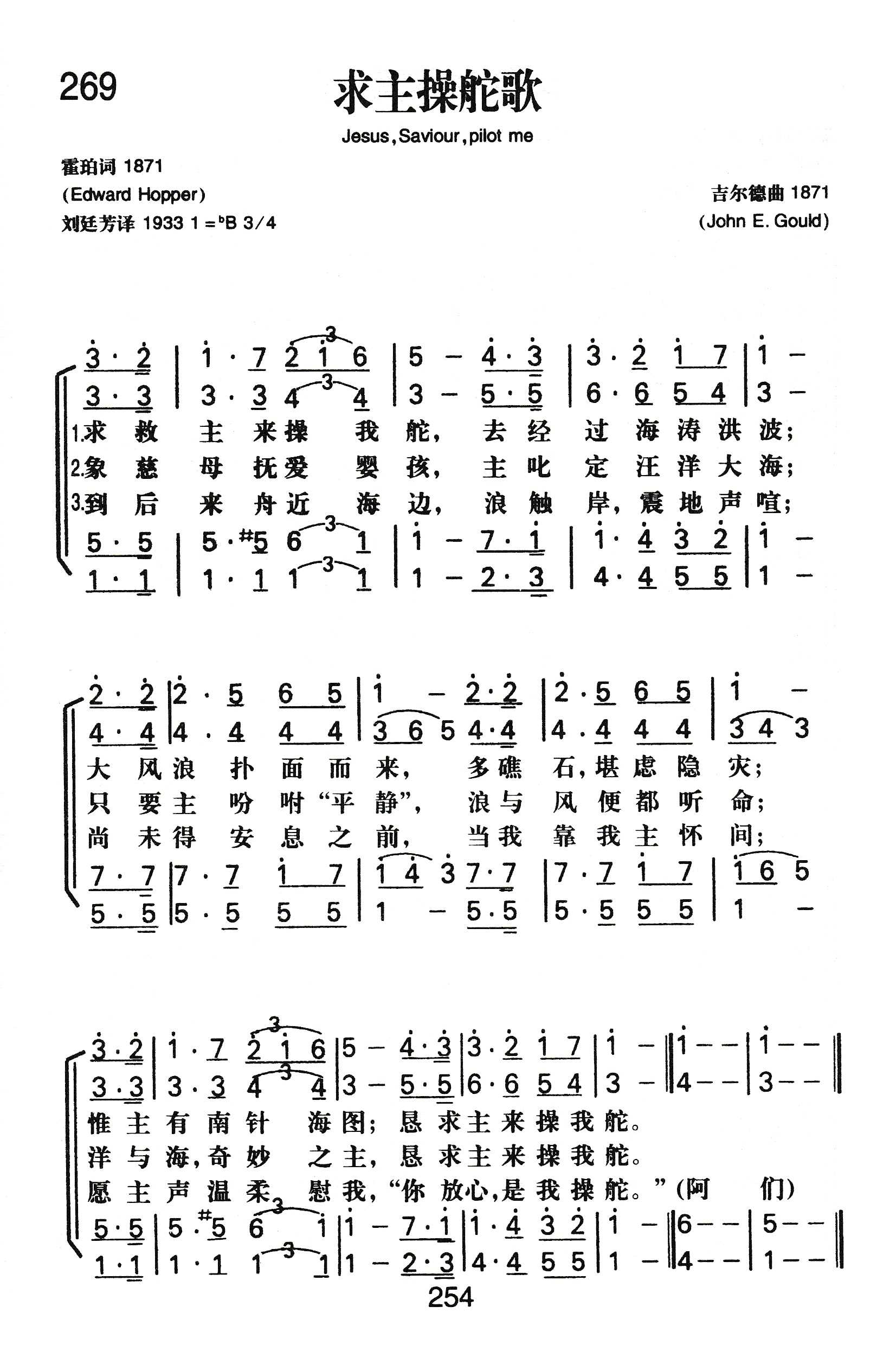 《求主操舵歌》生动地描写主耶稣是人生的舵手,这诗是美国长老会霍珀 (E.Hopper,1816-1888)牧师写的。霍珀多年在纽约一座海滨教堂工作,他所服务的对象多半是海员。他针对他们的经验、阅历,航海中需要有“南针海图”,说明在人生的航程上也要恳求主“来操我舵”。所以,霍珀为水手信徒写了这首诗。该诗作于 l871年,最初在《海员杂志》上发表,以后被选入浸会赞美诗和鲁宾逊灵歌集内。188O年5月1O日海员友谊会在纽约百老汇举行年会,事先曾函请霍珀牧师写一首圣诗作为纪念,霍氏将这首诗抄奉。从此以后得到广泛的赞扬,并被选进更多的赞美诗集中。[dropdown_box expand_text=”全文” show_more=”显示” show_less=”折叠” start=”hide”]