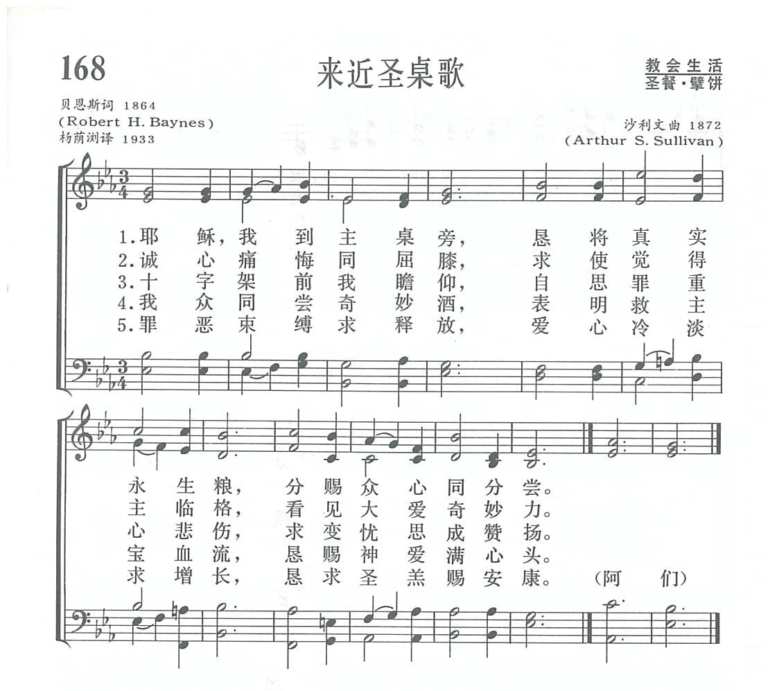 《来近圣桌歌》是英国圣公会牧师贝恩斯所写,最初发表于他所主编的《坎特伯雷赞美诗集》。贝恩斯 (R.H.Baynes,1831— 1895)乃英国一位圣公会牧师之子,牛津大学毕业后,于 1855年受圣职,历任伦敦、梅德斯通、考文垂教区牧职,曾任伍斯特座堂荣誉法政牧师 (见第87首注①),最后任福克斯通地方圣三一堂区牧。他曾编辑若干卷宗教诗集和赞美诗。[dropdown_box expand_text=”全文” show_more=”显示” show_less=”折叠” start=”hide”]