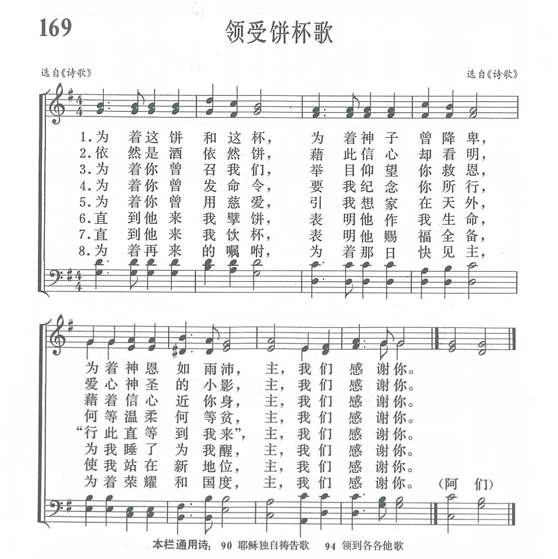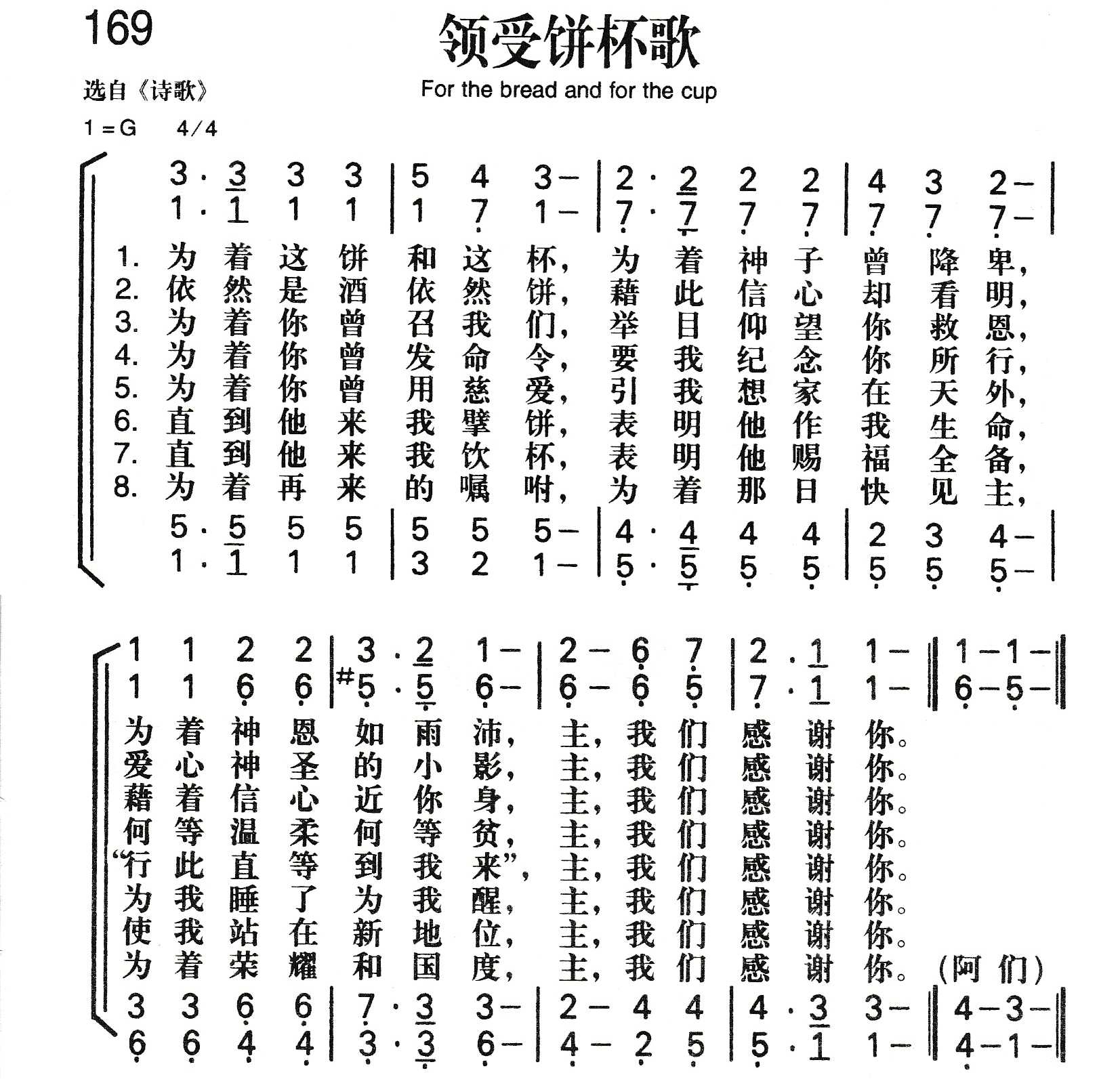 《领受饼杯歌》在《新编》五线谱上注明是选自《诗歌》,可能源出自英文的《小群诗歌》 (Hymns fof the Little Flock)》。据唐守临长老 (事略参阅第51首)说:是他从《得胜者 (Consecration and faith)》里翻译出来的。