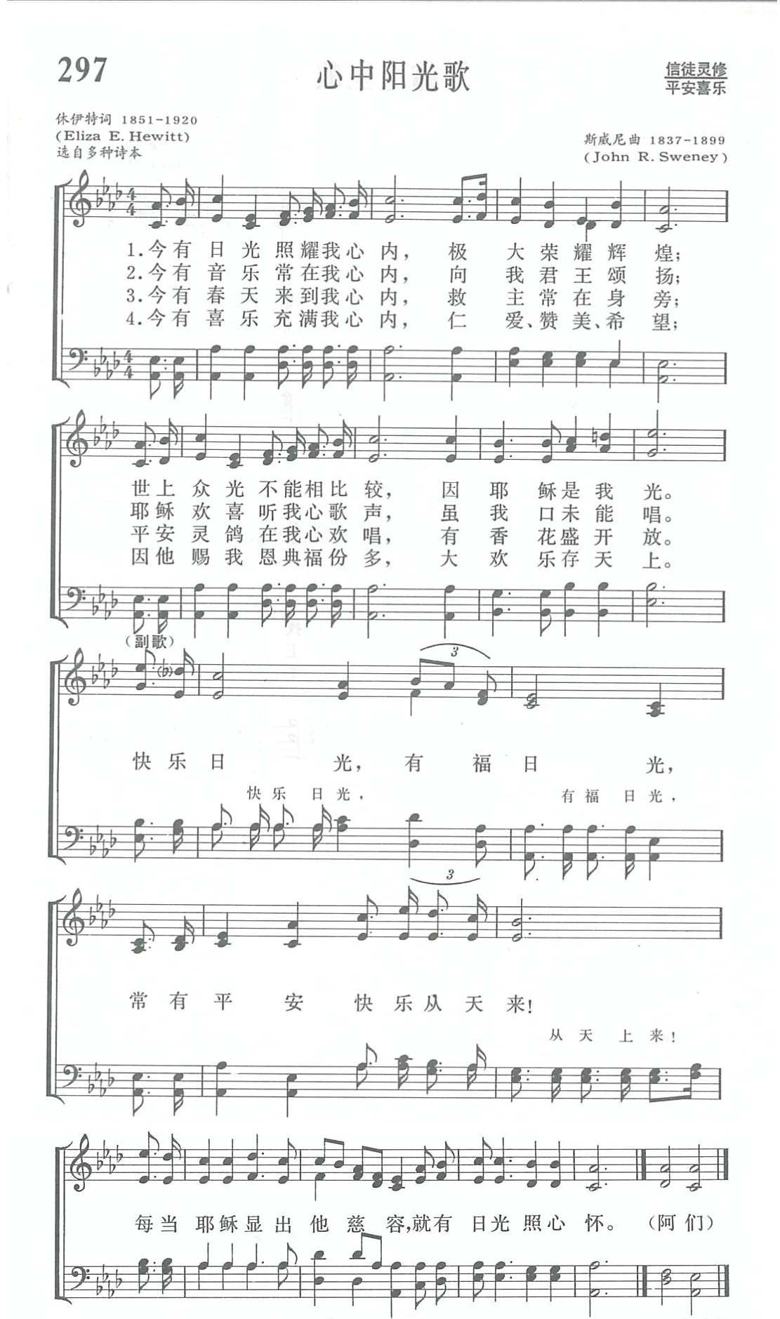 休伊特夫人曾写过许多圣诗,出版后由福音派作曲家为之谱曲,最早为她谱曲的是斯威尼 (事略参阅第65首)。这首诗的调名为《阳光(SUNSHINE)》,也是斯威尼所谱。