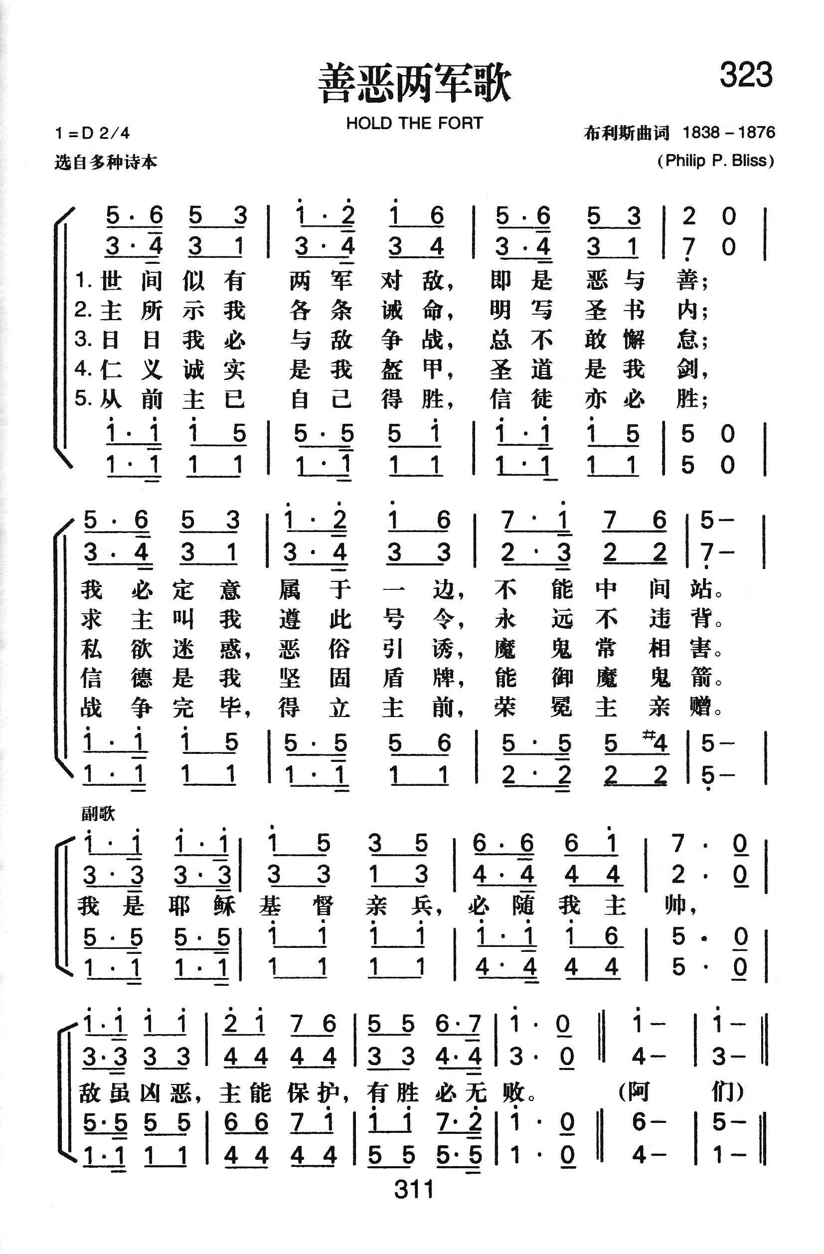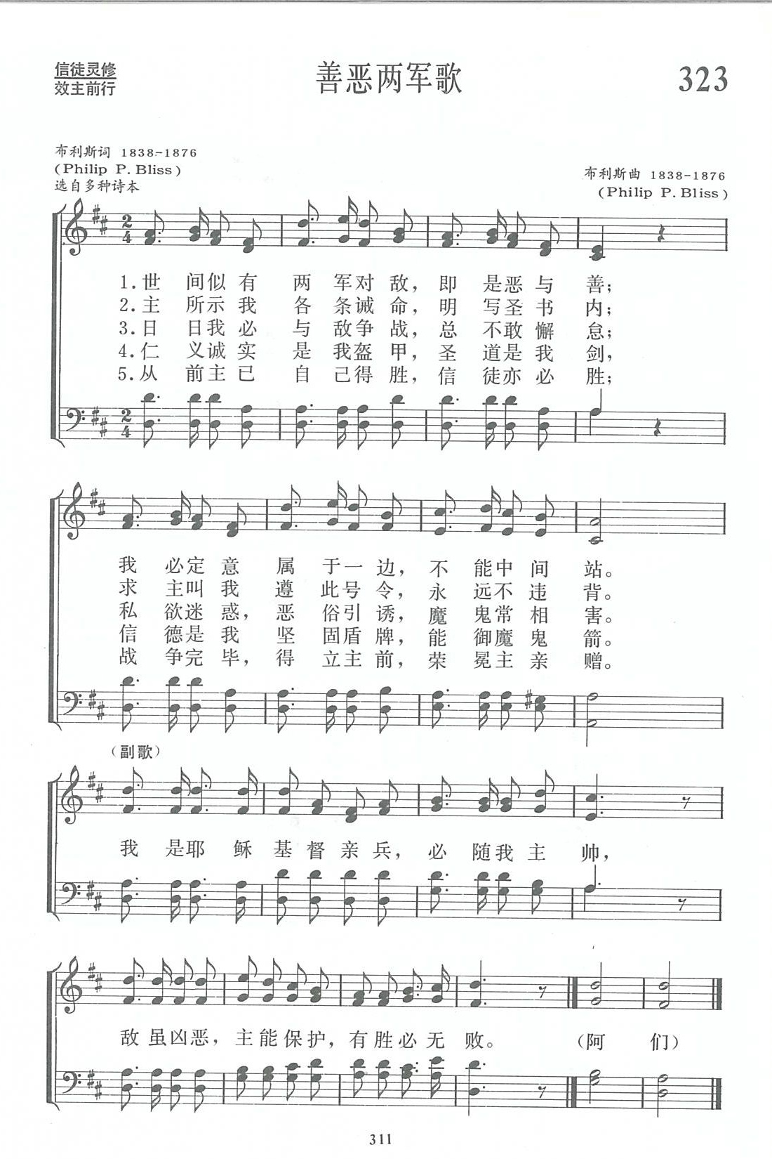 《善恶两军歌》是早期英国圣道会传教士理一视(见第316首注①)根据布利斯 (事略参阅第 197首)原作而改写的一首诗,与布利斯的原作有很大出入。现将布氏原诗一、三两节和副歌直译如下: