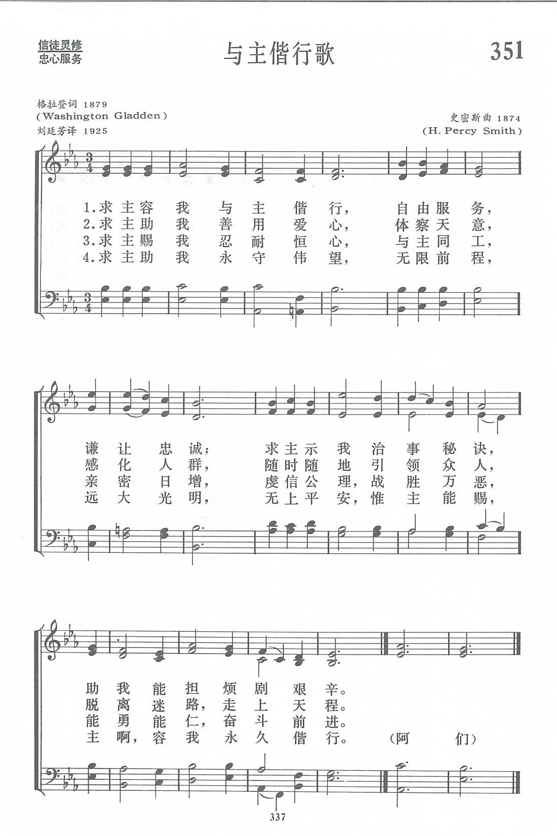 这首诗所用的曲调名为《MARYTON 》,是英国圣公会牧师史密斯(H.P.Smith,1825一1898)所谱。史密斯 (见第326首注②)毕业于牛津大学,1849年被立为会吏;翌年升为会长,一生除在英国好几个教堂从事牧职外,晚年还到法国和地中海直布罗陀等地任英侨礼拜堂牧师,业余时间谱写若干赞美诗曲调。这首《MARYTON》原是配《我灵之光歌》(《新编》第 156首词)的,因它朴实简洁,被编入其它赞美诗时,也可作为其它圣诗的调,配上《与主偕行歌》后,就很少改变,也为许多福音派圣诗集所采用。[/dropdown_box]
